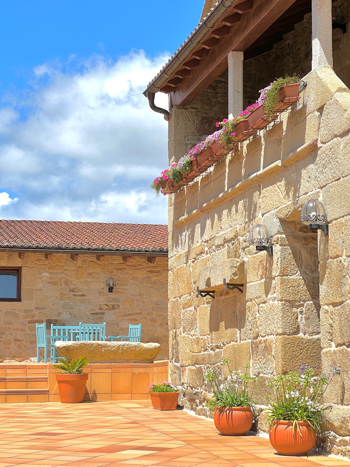 Habitación con baño bellamente decorada, con paredes de granito originales, cama matrimonial, ropa de cama lujosa, armario y baño con todas las comodidades. Encontrarás una gran cantidad de espacios tranquilos en nuestra propiedad con sus hermosos jardines, áreas para comer y relajarse al aire libre, cala de bambú, piscina y fuentes de agua de manantial. Rodeados de bosques de eucaliptos y lagunas, hermosas playas, antiguos molinos de agua e impresionantes vistas de la ría de Arousa.