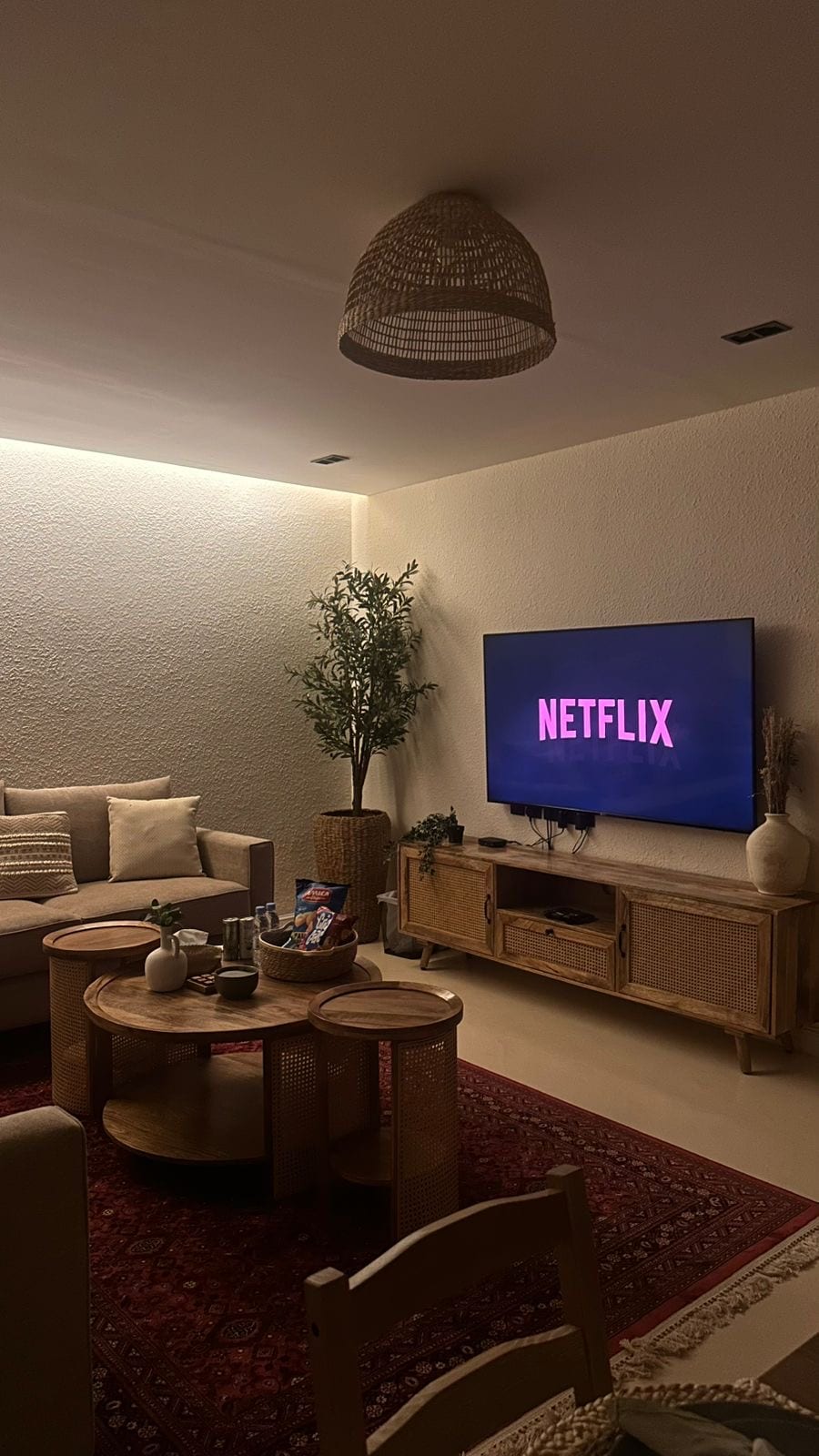 Relax with the whole family or friends at this 3-bedroom peaceful place to stay. Furnished patio & terrace with gas fire pit operational in winter, projection media room with Netflix, STCtv, Shahid vip tv, indoor heated swimming pool operational only in summer, two family rooms, full kitchen, washing machine, 4-full bathrooms, free 8-car parking, driver private room with kitchen & bathroom.