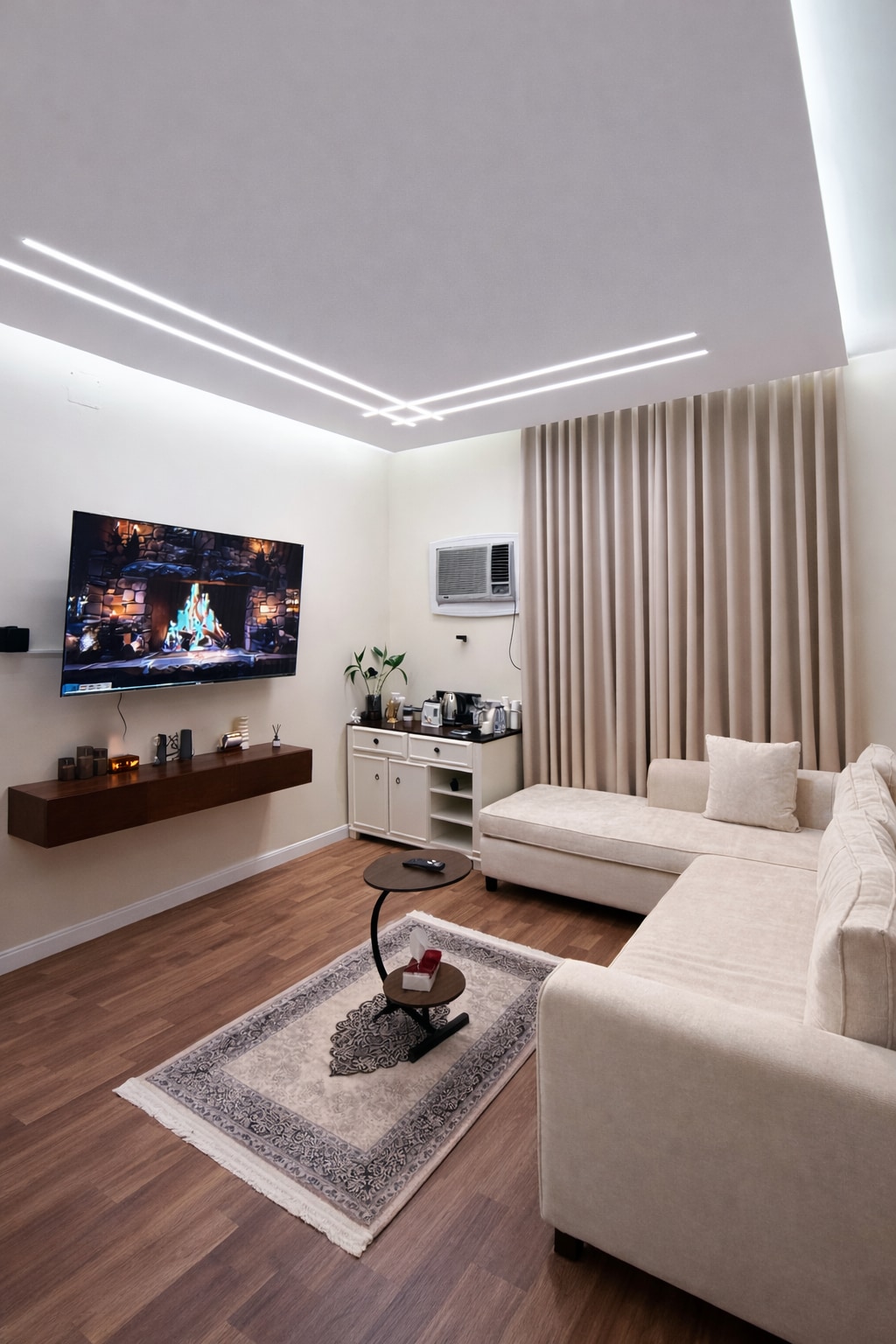 مرفق سياحي هادي ومنعزل وسكن خاص وصول ودخول ذاتي Netflix بث مباشر لقنوات العالم YouTube إنترنت مفتوح شاشة 75 بوصة مكينة قهوة سوداء مع المطحنة والبن ثلاجة صغيرة