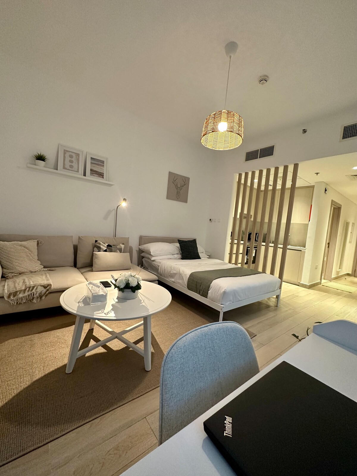Estudio de estilo japonés en Soho Square, Isla Saadiyat. Ideal para estadías largas, trabajo remoto o una escapada tranquila a la ciudad. Totalmente amueblado con WiFi de alta velocidad, cocina, piscina, gimnasio y estacionamiento seguro. Se puede caminar hasta NYU Abu Dhabi, Louvre y Soul Beach. Tranquilo, luminoso y cuidadosamente diseñado para la comodidad y el funcionamiento. Disfruta de un espacio tranquilo y seleccionado con todo lo que necesitas para sentirte en casa, ya sea que estés aquí un fin de semana o un mes.