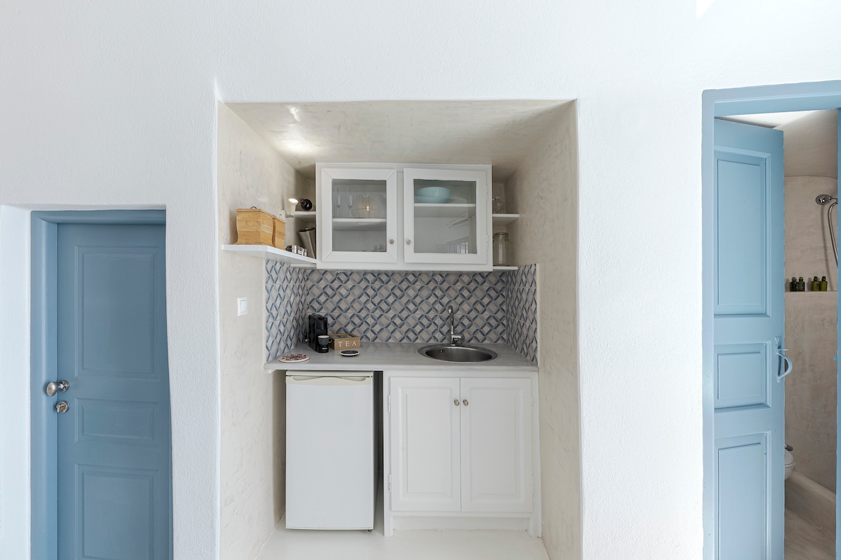 Esta elegante suite está encaramada en los acantilados de la caldera en Oia. Combina la arquitectura tradicional de las Cícladas con un estilo decorativo minimalista, por lo que es la opción perfecta para aquellos que quieren relajarse. La suite tiene aproximadamente 37 metros cuadrados, cuenta con una bañera de hidromasaje privada al aire libre en una cueva, que ofrece privacidad junto con impresionantes vistas de la caldera y el volcán. El desayuno está incluido en el precio. La habitación está equipada con aire acondicionado, wifi gratuito, cafetera y tetera, artículos de tocador y TV inteligente.