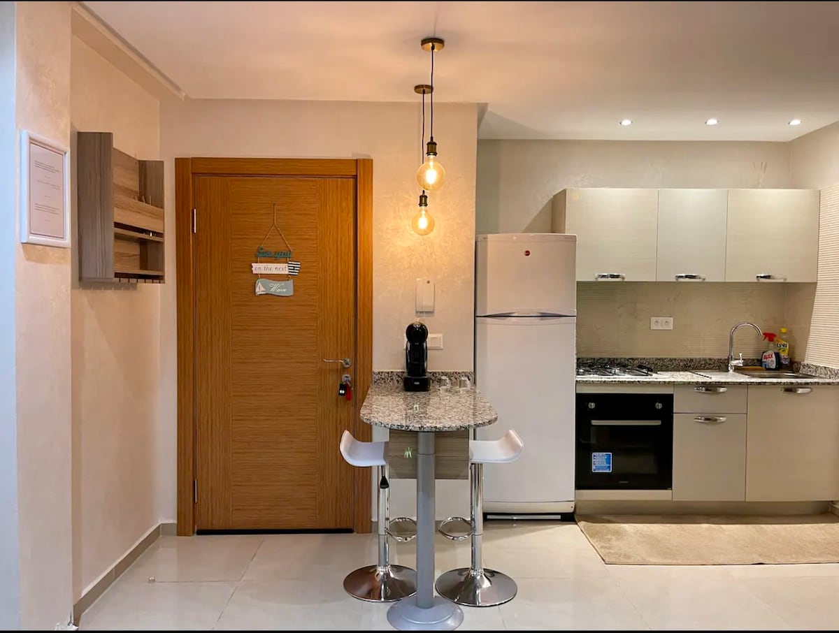 una gran sala de estar con aire acondicionado abierta a una cocina americana muy bien equipada y un balcón con vistas a la piscina con un televisor inteligente de 50 pulgadas IP TV con Netflix y Shahid gratis... el dormitorio con su balcón lo suficientemente grande para hacer deporte y relajarse frente a la piscina . un baño moderno con todas las comodidades necesarias: toallas papel higiénico gel de ducha jabón de manos...