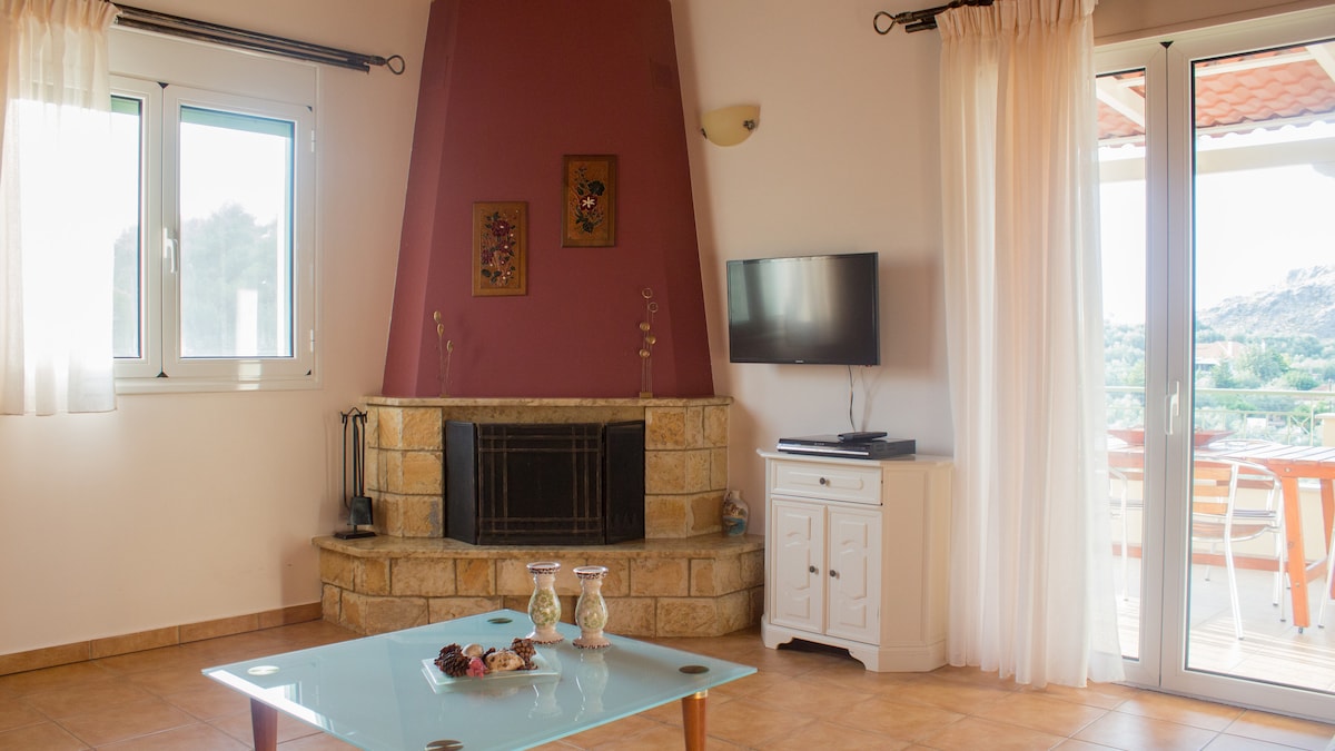 La casa está ubicada en las afueras de Nafplio. Está rodeada de un maravilloso jardín lleno de olivos y naranjos y varias plantas, plaza de estacionamiento para los huéspedes, hermosa vista desde la terraza de 30 m2 y desde todas las ventanas de la casa.