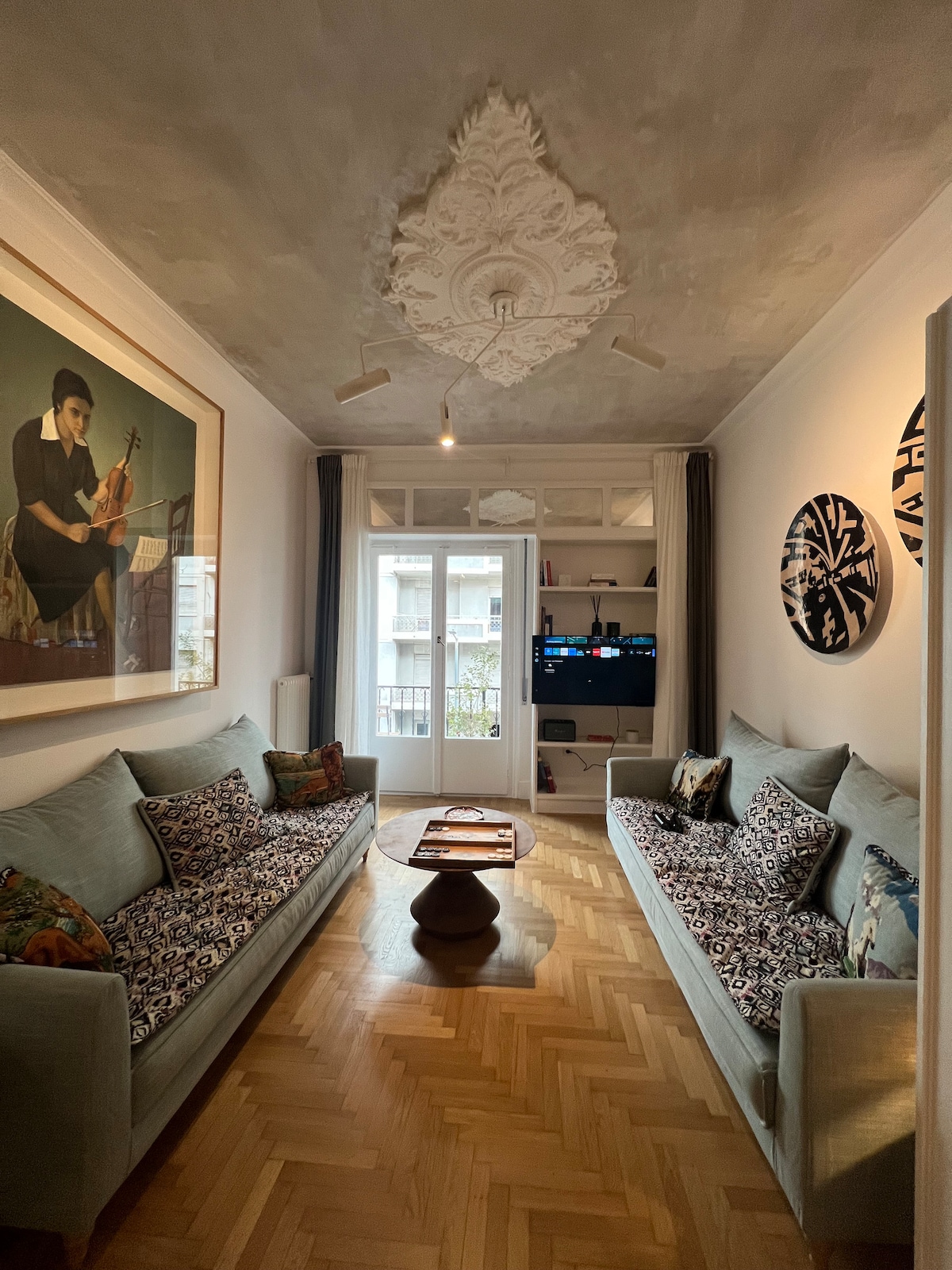 Un ático de estilo real verdaderamente único a solo 8 minutos del aeropuerto de Atenas. Al igual que un museo privado, cuenta con antigüedades, camas extragrandes de 200×220, una gran terraza privada y acceso a la azotea para disfrutar de vistas panorámicas y avistamiento de aviones. Ideal para familias, con mucho espacio y carácter que no encontrarás en ningún otro lugar de la zona. Las puertas de vidrio inundan el espacio con luz natural y enmarcan el cielo abierto, una estancia única que combina el encanto clásico con las raras vistas de la ciudad.