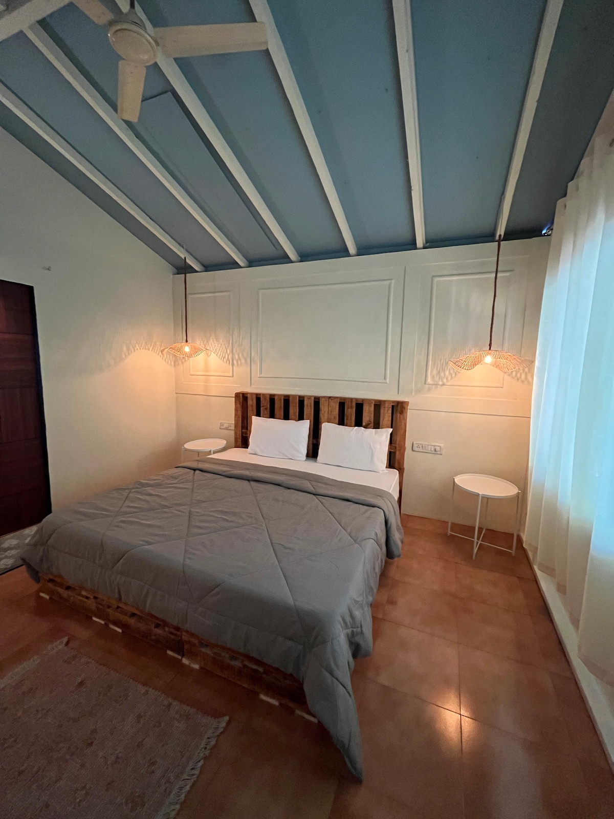 Nuestro alojamiento es un dormitorio muy sencillo pero cómodo con un baño separado. Se encuentra a solo 5 minutos a pie de la playa. Cuenta con un colchón de muelles tamaño king adecuado para garantizar que duermas bien durante la noche. Cuenta con un pequeño espacio exterior para disfrutar del sol de Goa. La habitación se encuentra en la planta baja de un edificio de dos pisos en una zona tranquila. ¡Perfecto para parejas, aventureros solitarios, viajeros de negocios e incluso para tus amigos peludos! Da la bienvenida a tu refugio perfecto.