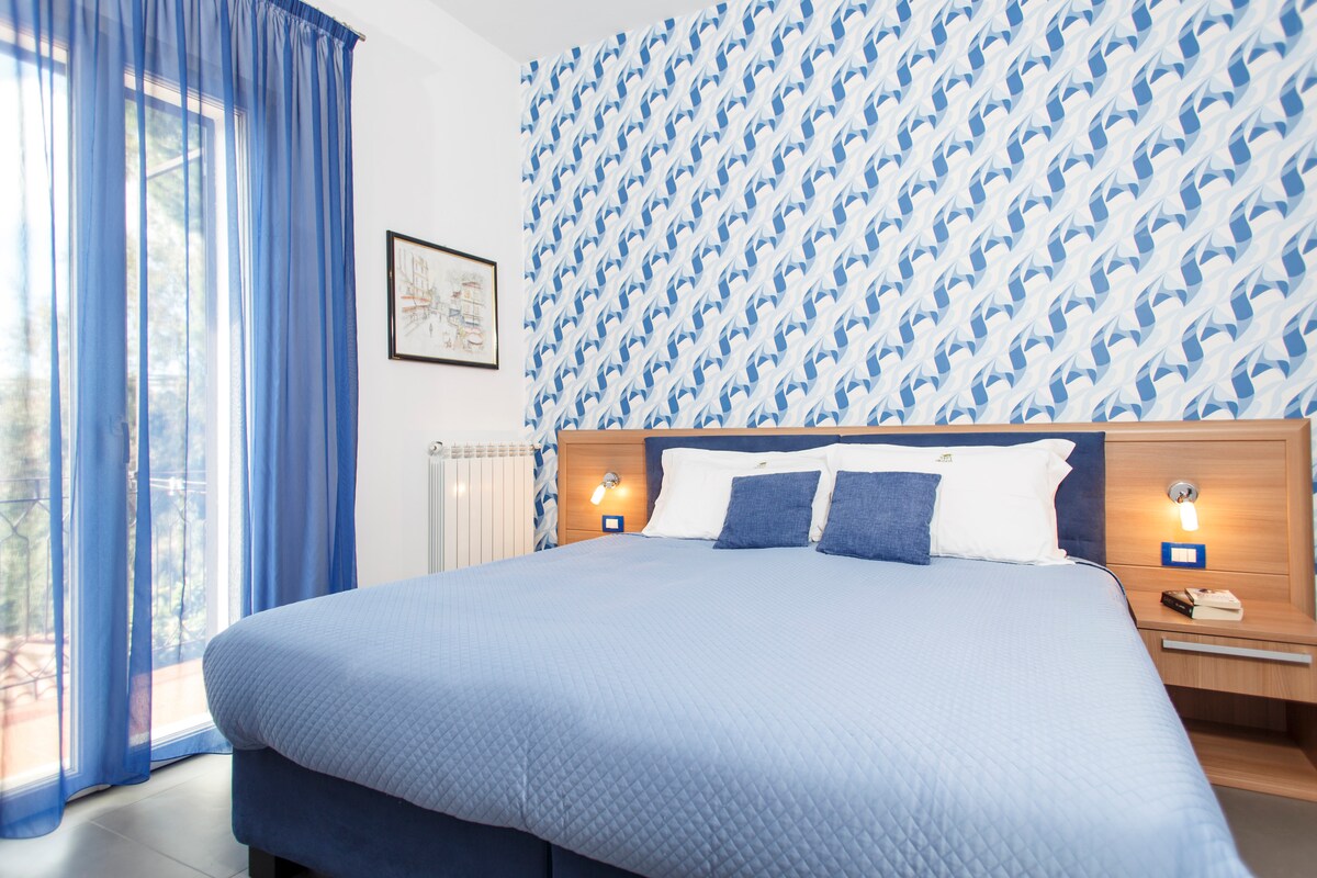 Camera arredata con gusto, letto matrimoniale confortevole ed accessoriata: balcone con vista, Wi-Fi, TV, climatizzatore, riscaldamento autonomo.