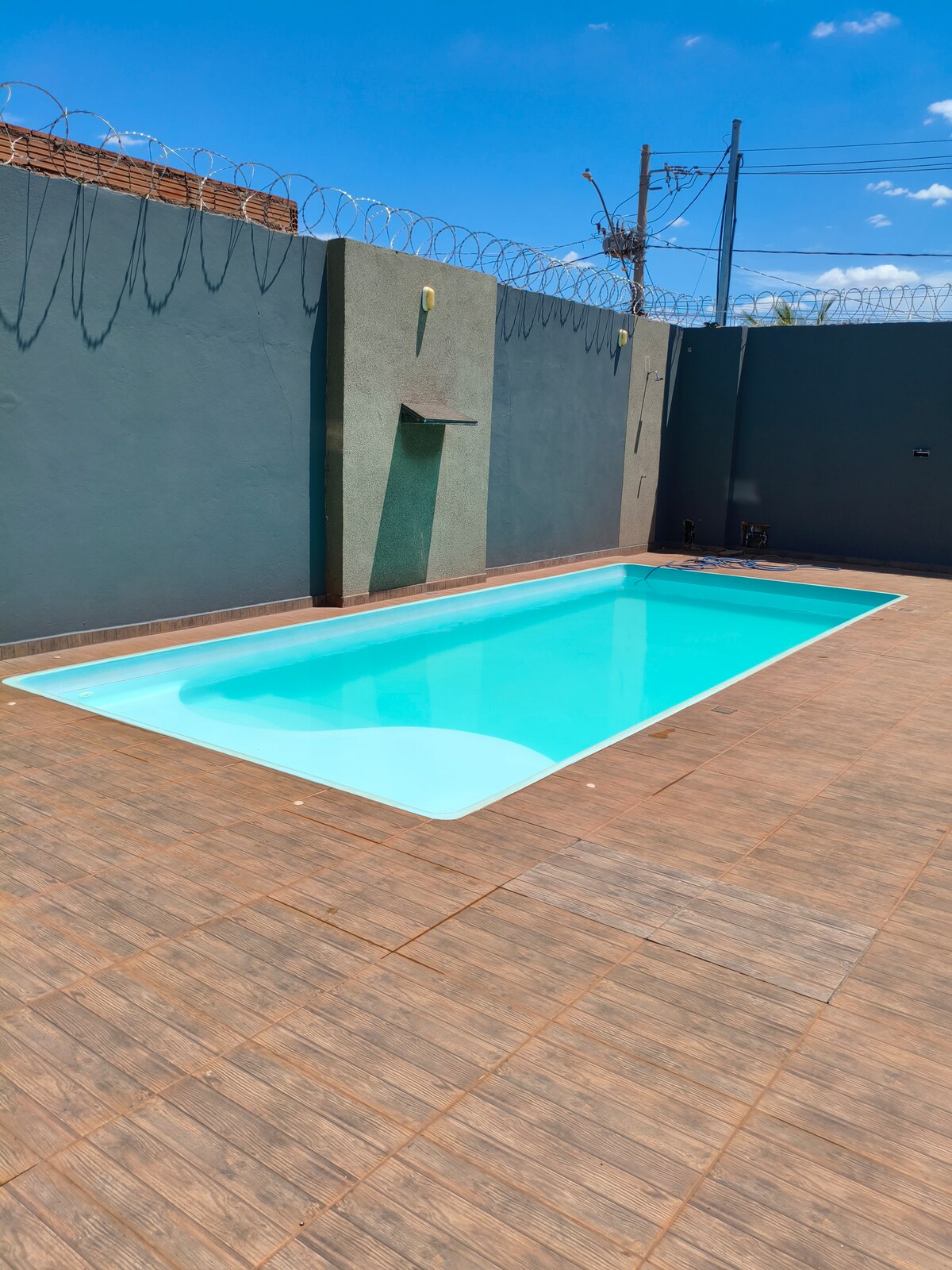 Casa com área de lazer. A casa possui 1 quarto com duas camas de casal e um colchão, guarda roupa e ar condicionado. Possui um amplo banheiro interno e 2 banheiros externos tipo "masculino e feminino". A sala conta um sofá retrátil e reclinável. A casa fornece ainda internet Wi-Fi. Área externa com mesa e cadeiras, churrasqueira e piscina limpa exclusiva para recebê-los.
