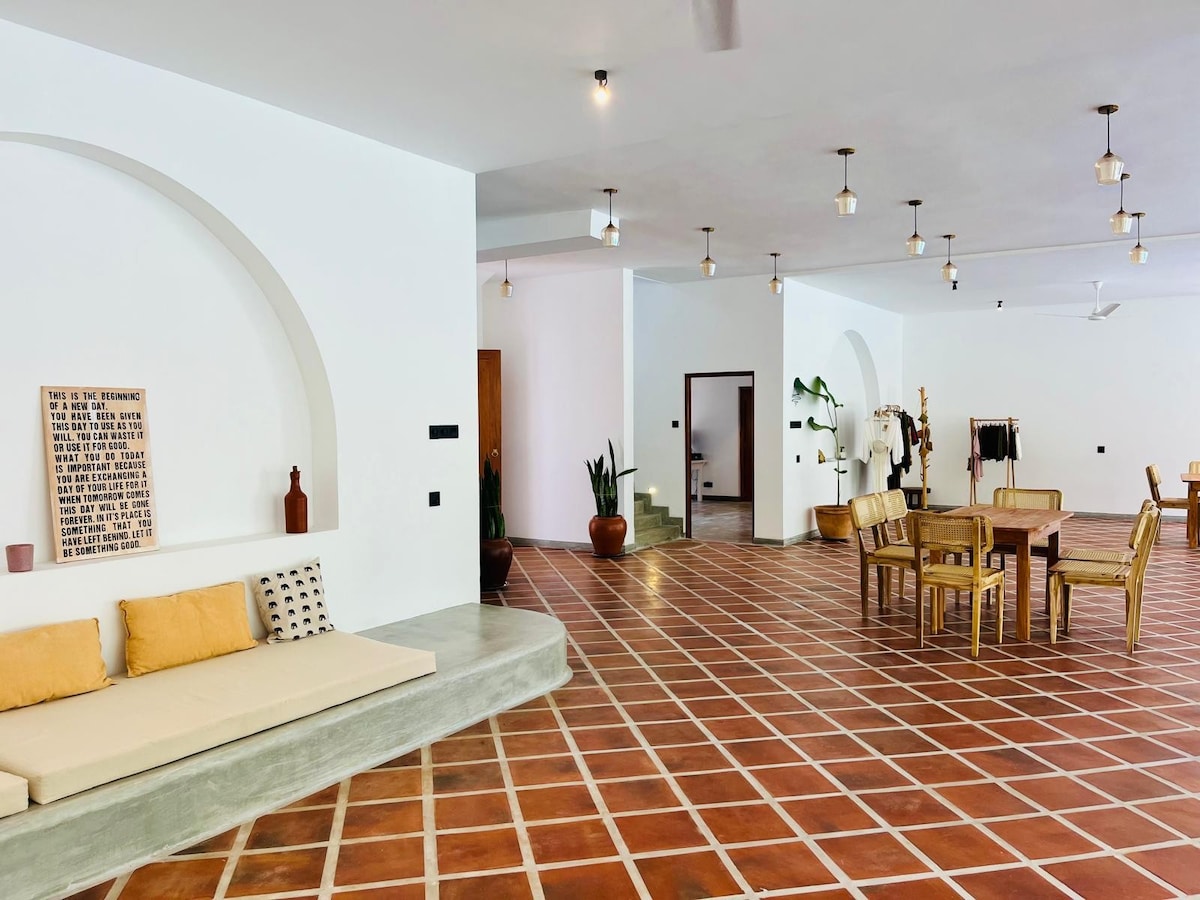 Más allá de una entrada discreta se encuentra una pequeña villa de lujo en las afueras de un pueblo. Está escondida en una pequeña colina en medio acre de verde jardín tropical con una piscina de 12 m. Cerca de los restaurantes y tiendas del Patrimonio de la Humanidad de la UNESCO, el fuerte de Galle, y cerca de las famosas playas de surf de la costa sur. La escapada o escondite perfecto para recargar o crear esa obra maestra que siempre soñaste. La casa está bien equipada, incluyendo paneles solares y baterías, por lo que no hay cortes de energía.