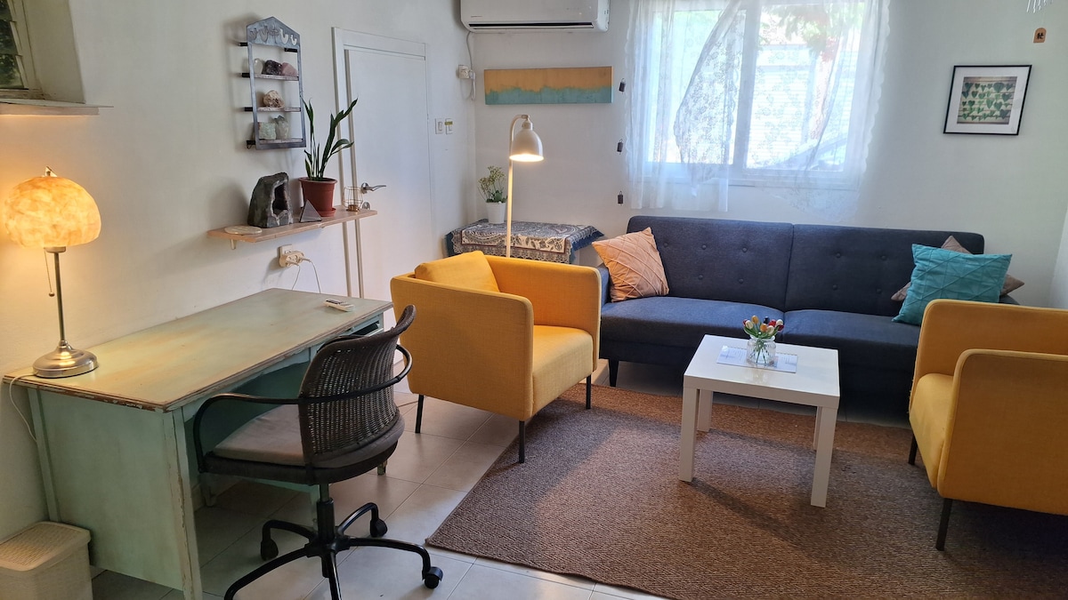 Apto para personas LGBTQ+ Todos son recibidos con amor, en un ambiente acogedor y relajado Tómate un descanso de la vida ajetreada en el apartamento verde. Disfruta del enorme jardín con árboles frutales y hierbas, un césped central con dos hamacas y la sombra de los árboles. El apartamento está situado en el corazón de Binyamina, cerca de tiendas, restaurantes y cafeterías. A poca distancia en coche del anfiteatro de Shuni, la playa, Cesarea y Zichron Yaakov. Además, puedes rejuvenecer en nuestro estudio privado a precios atractivos. Si está celebrando un evento, háganoslo saber, estaremos encantados de añadir un toque adecuado...