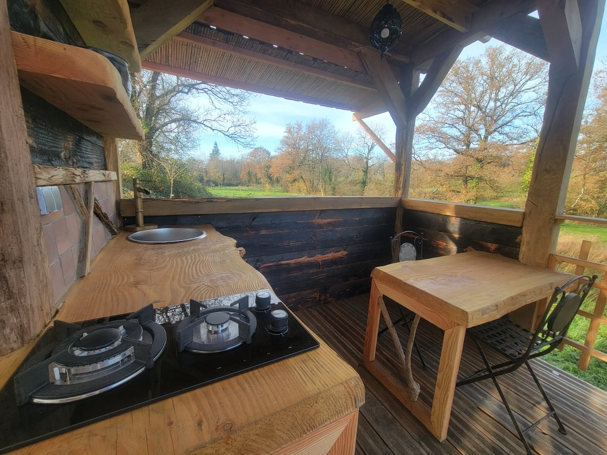 Descubre el refugio de Elrond: ¡una experiencia mágica en plena naturaleza! En un campo tranquilo, desde su cómoda cama, disfrute de una vista impresionante de la bóveda celeste Una cocina al aire libre llena de encanto para cenar mientras se admira la puesta de sol Un baño exterior cerrado con todas las comodidades, con una gran ducha, un lavabo y un inodoro seco (situado a un metro de la entrada de la habitación) Sumérgete en un baño nórdico calentado con leña, perfecto para una velada relajante.