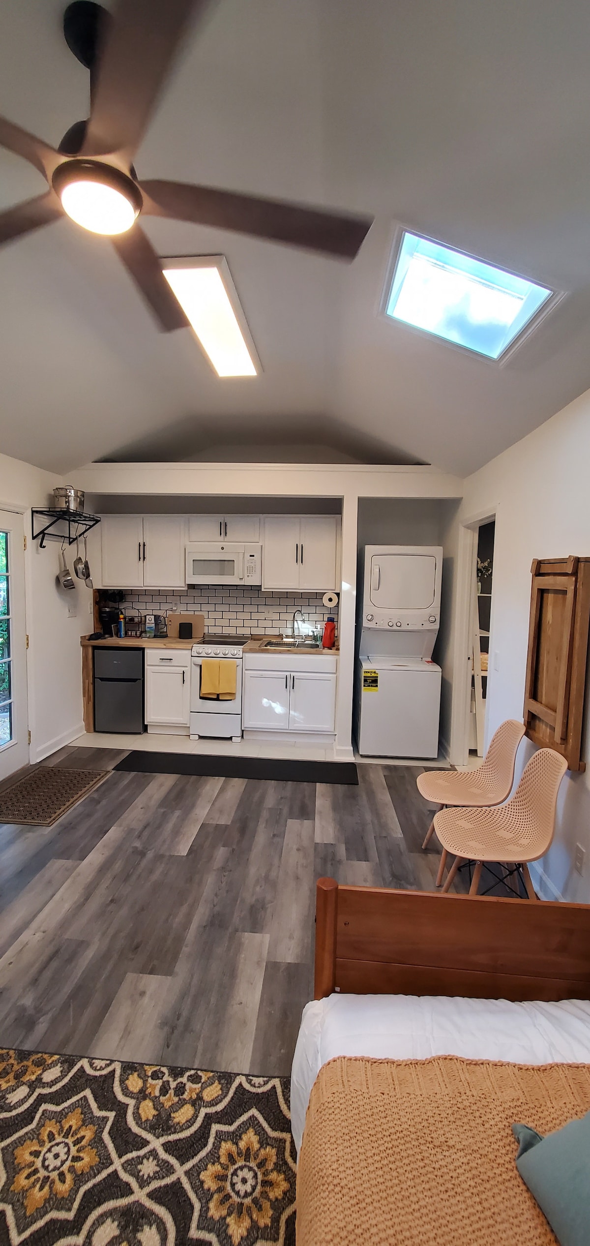 Luminoso y encantador apartamento tipo estudio de 408 pies cuadrados con una cama tamaño queen, escritorio, sillón/otomana, baño privado de 3 piezas y cocina pequeña (fregadero, mininevera y microondas). También incluye un armario dedicado, una estación de café bien surtida, TV inteligente, portaequipajes, tabla de planchar de tamaño completo y secador de pelo. Las ventanas y las puertas francesas ofrecen persianas romanas con paneles opacos para mayor privacidad. El acceso a una zona de estar al aire libre con chimenea también está incluido. Conveniente para las atracciones locales en Aiken, SC y Augusta, GA.