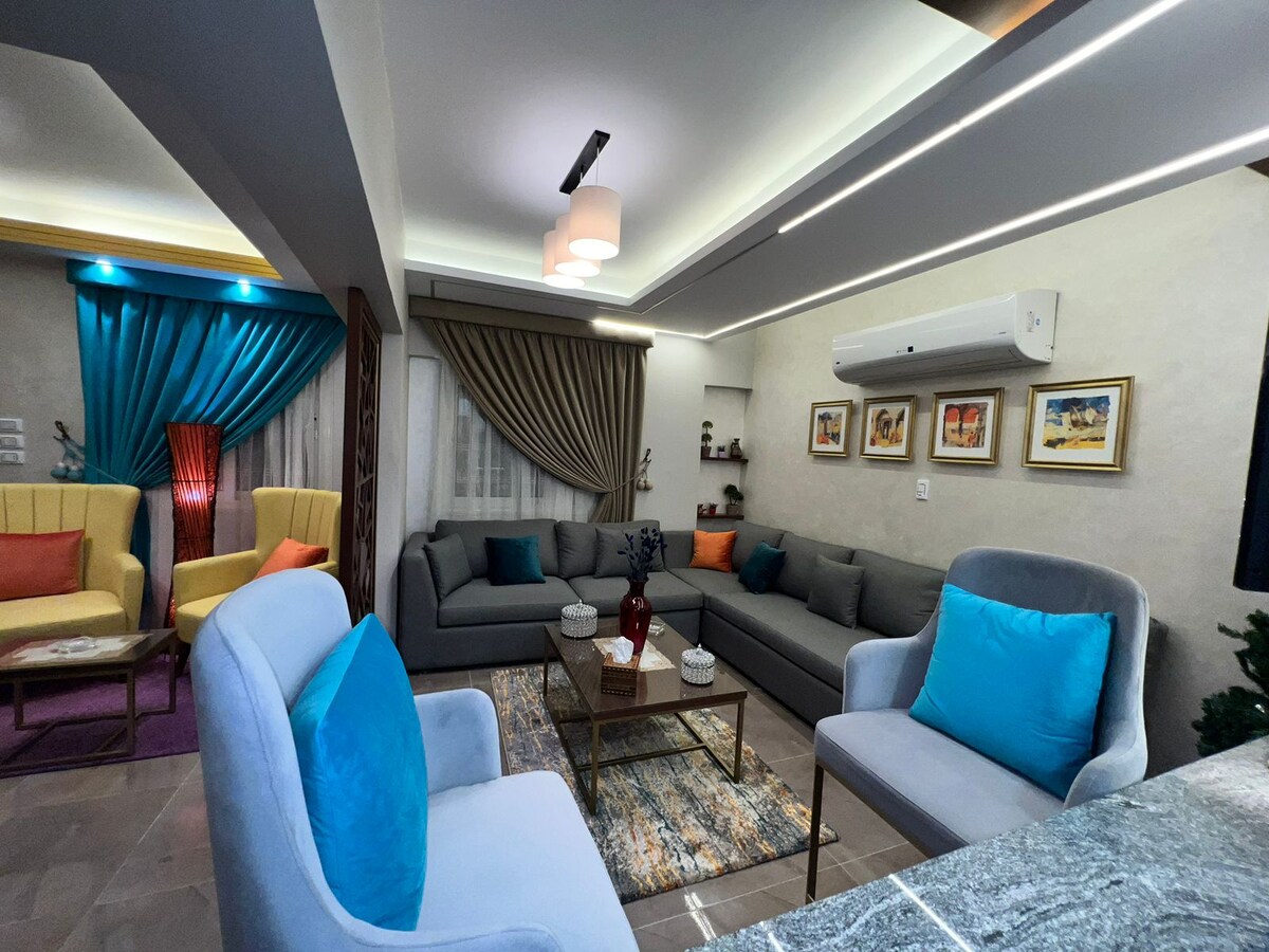 Apartamento de lujo bellamente diseñado. Planta privada de 2400 pies cuadrados. Una escapada perfecta para familias/personas que buscan una estancia limpia y bien amueblada en Ard El Golf, Heliópolis, El Cairo. Una vista panorámica al jardín junto con una zona soleada y espaciosa con aire acondicionado (frío y calor). Servicios inspirados de alto nivel. Barrio acogedor. La estación de metro está a 8 minutos a pie, los famosos centros comerciales y las tiendas de comestibles están bastante cerca. En general, nada es mejor que una ubicación segura única.