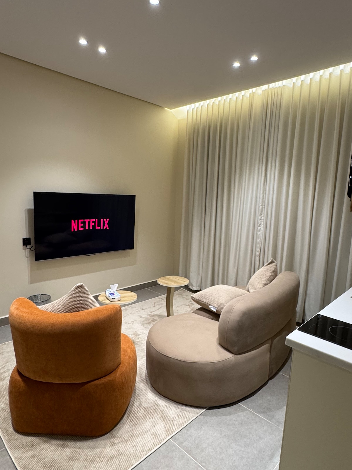 شقة أنيقة بتصميم عصري وألوان هادئة تتميز بصالة واسعة وكنب مريّح للاسترخاء يمنح المكان الراحة والفخامه