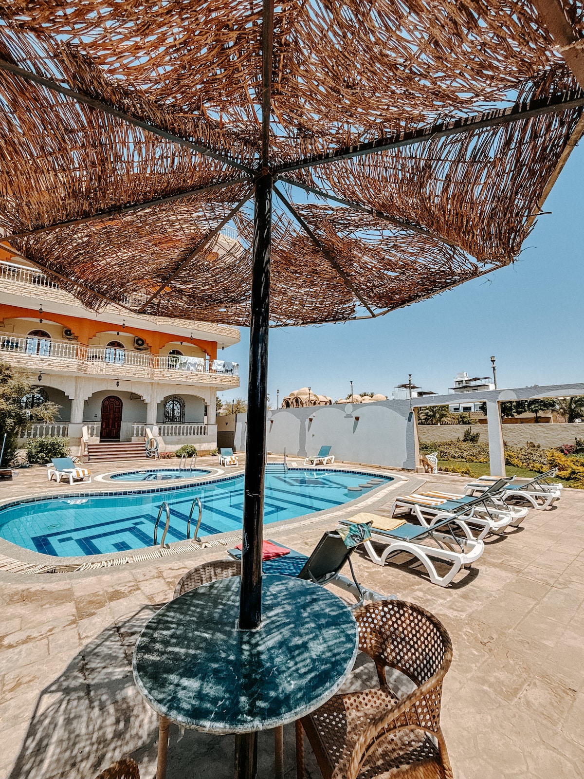 Excelente ubicación. Tiendas, restaurantes, a 2 minutos a pie del ferry del puerto de Cisjordania. Relájate en el interior con vistas al jardín. Acogedor, mucho espacio, apartamento tipo estudio privado, desayuno de 7:00 a 10:00. Coche disponible para todos los viajes alrededor de Luxor (tarifa no incluida). ¡Reserva un paseo en globo aerostático con nosotros! Cerca de restaurantes locales, tiendas, supermercado, taxi, lancha a motor. Gente buena, barrio tranquilo. Vista del Templo de Luxor desde el puerto de transbordadores. A solo minutos en taxi del templo de Hatshepsut, King y Queen Valley.