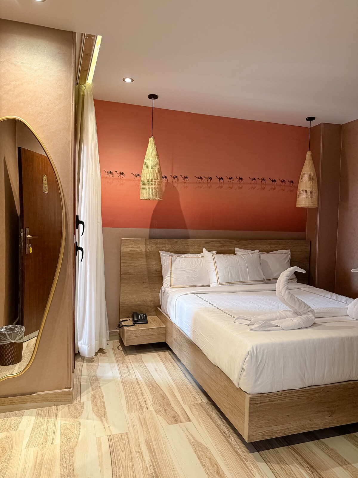 Enjoy a wonderful travel experience in this residence. Experience a blend of luxury and history in our elegant studio, located steps from the famous Pyramids of Giza, the Great Sphinx, and the Grand Egyptian Museum. Whether you're a history buff or looking for a picturesque retreat, this wonderful space offers the perfect stay for unforgettable moments. The elegant interior features luxurious furnishings, rich fabrics, and modern amenities. Relax in an atmosphere of peace and tranquility.