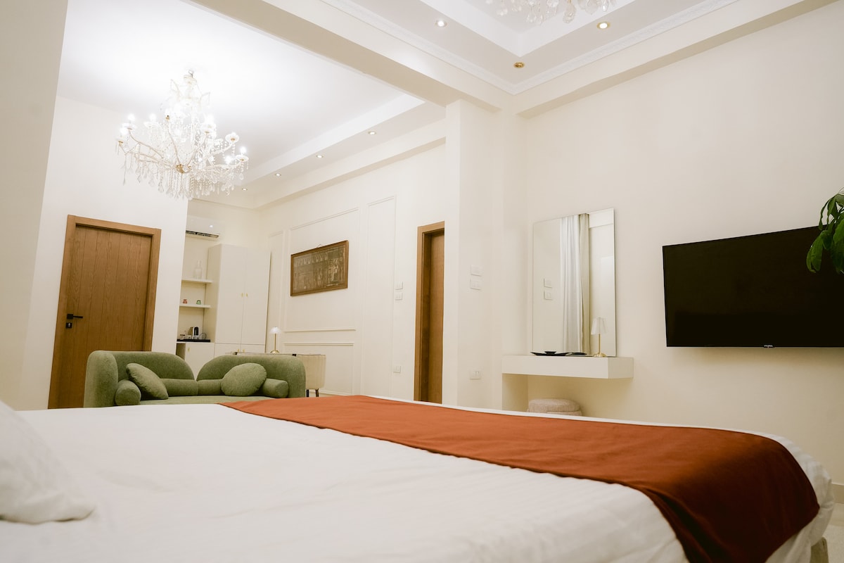 Peaceful Luxury Suite with a Garden View Escape to a peaceful Retreat at Sphinx House, where village charm meets modern luxury. overlooks a lush garden, offering a serene setting perfect for relaxation and reflection. Designed to blend the simplicity of rural life with the elegance of high-end hotels, the space features warm textures, clean lines, and a soothing ambiance. Enjoy restful nights in a plush queen-size bed and wake up to the sounds of nature just outside your window.
