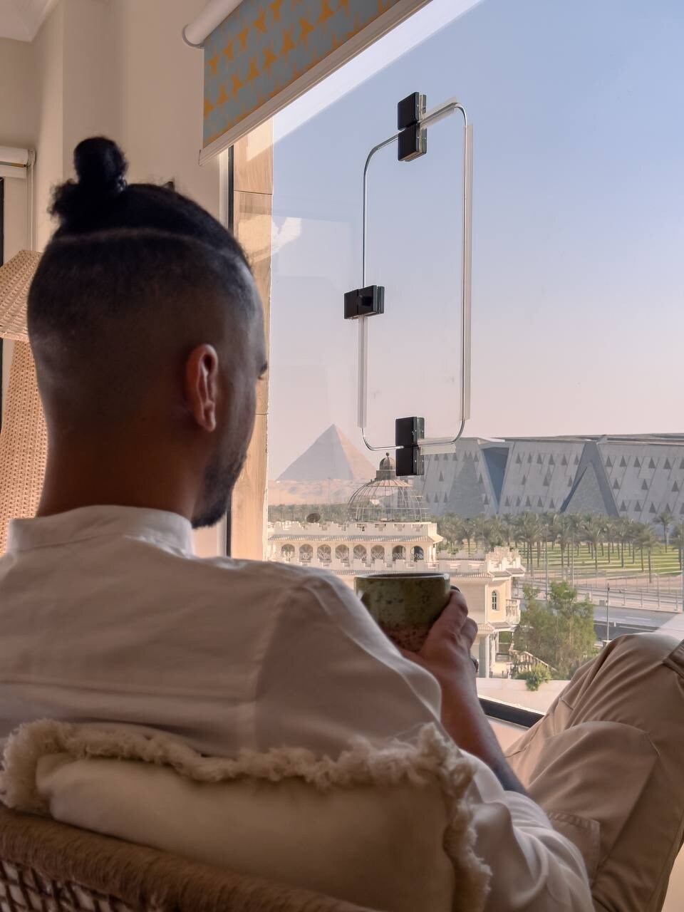 El Khan de las Pirámides, un refugio único donde el diseño artesanal se encuentra con maravillas antiguas. Este sereno apartamento se encuentra en El Haram y ofrece una vista directa de las pirámides desde tu cama o jacuzzi. Cada rincón está lleno de texturas terrosas, piezas seleccionadas y luz natural, diseñadas para la vida lenta, las noches de descanso y las mañanas mágicas con una vista que es realmente inolvidable. Tanto si eres una pareja, un viajero solitario o un alma creativa en busca de inspiración, este Khan es tu refugio en Guiza.