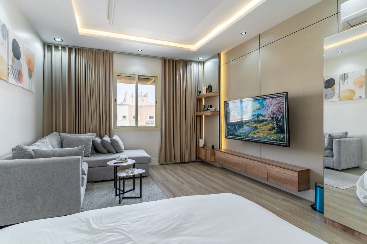 Relájate en este espacio único y tranquilo Consta de un amplio dormitorio con una cama tamaño king con un colchón cuidadosamente seleccionado para disfrutar de un sueño completo, un baño completo, un televisor inteligente de Samsung e Internet de alta velocidad. También contiene una persiana para la ventana para aislar el sol, el polvo y el sonido para disfrutar de una estancia tranquila y cómoda. Se encuentra en el norte de Riad, en el barrio de Al-Malqa, cerca de todos los servicios, supermercados, farmacias, restaurantes, lugares de ocio y lugares famosos como Aeropuerto Metro Bulevar World City Kingdom of Arena Centro financiero Torre del Reino También hay disponibles servicios de limpieza, lavandería y planchado.