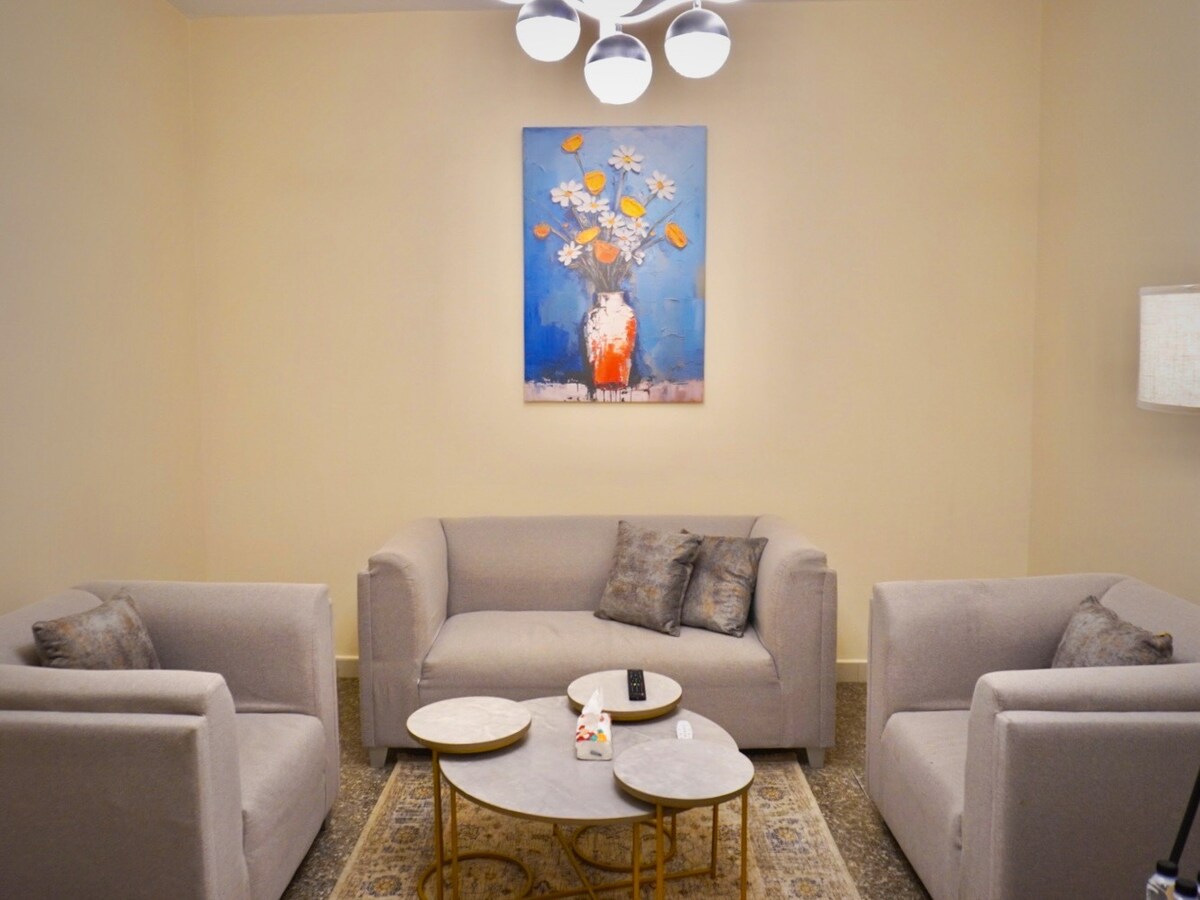 Apartamento de lujo con una habitación y un salón con vistas a Burj Al-Kharj. • A 4 minutos de la Torre Al Kharj • A 10 minutos de la universidad • A 10 minutos del Boulevard • A 10 minutos del Hospital Al Askari (Al Masani) • A 19 minutos del Hospital de las Fuerzas Armadas El apartamento está equipado con todo lo necesario para garantizar una estancia cómoda y lujosa, con wifi. y un espacio para relajarse