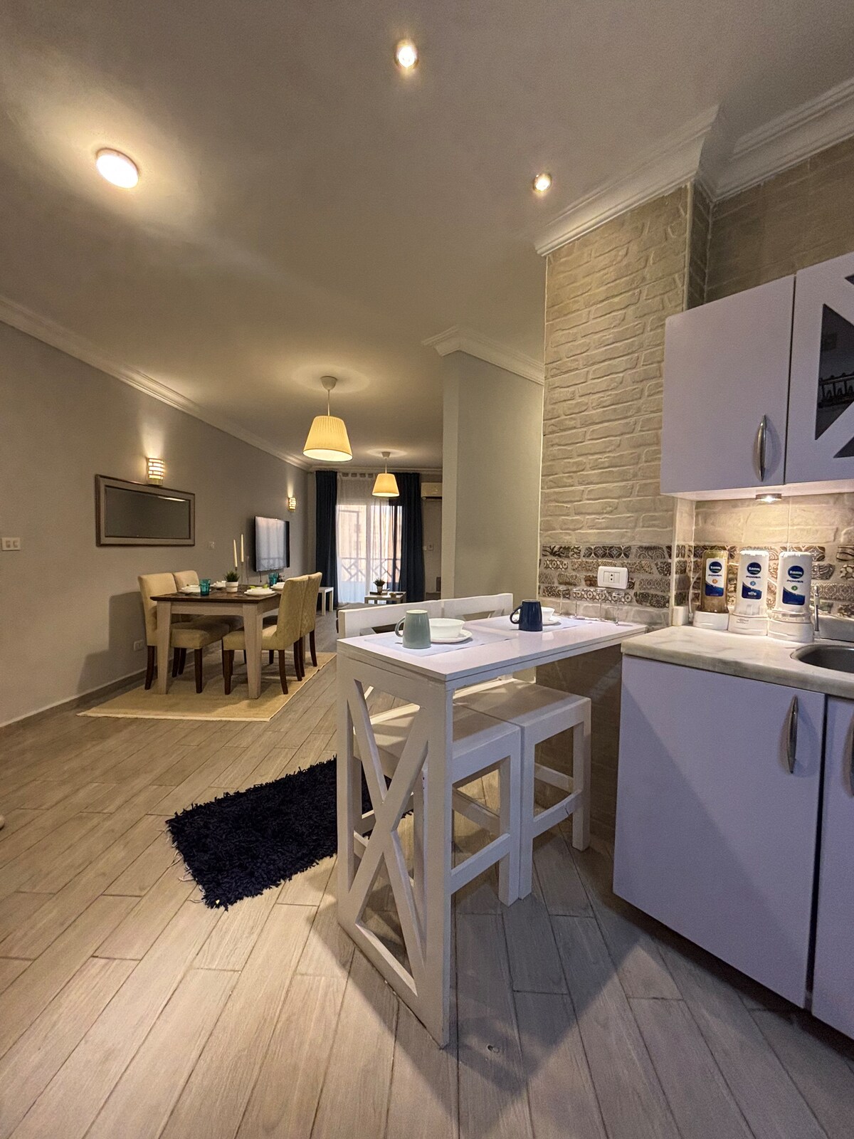 Welcome to the " CairoKey Apartment" - the Modern newly renovated fully furniture Apartment. Enjoy Cozy elegance, completed AC, and comfort. Stylish living area, fully equipped kitchen, and dining space. The apartment is located in a very prime location (Rehab Compound) with nearby attractions, shops, and dining options. -Near gate 19. -High-speed internet. - 20-25 mins from airport. We have a lot of extra services, don't hesitate to ask. Book now at CairoKey Apt for your great stay.
