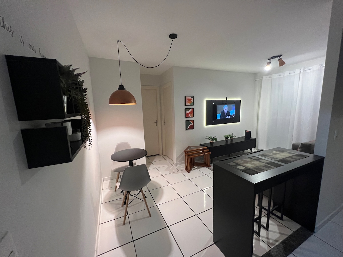 Apartamento moderno con unas vistas impresionantes, especialmente para la puesta de sol. Excelente ubicación, cerca de farmacias, gimnasio, UPA, panadería y frutería. Aparcamiento incluido. El condominio ofrece un mercado y un espacio para mascotas. Damos prioridad al reciclaje, con contenedores específicos. Tiene una televisión en el salón y en el dormitorio, además de una Nintendo para divertirse. La oficina en casa está bien equipada, con una pantalla adicional, alfombrilla para el ratón y silla para jugadores. Aire acondicionado en el salón (frío) y ventiladores/calefactores en los dormitorios.