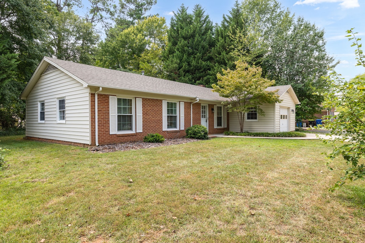 ¡Disfruta de esta cómoda casa de 1 nivel para tu estancia en Burlington! En un barrio tranquilo y establecido, cerca de todo: hospitales, acceso interestatal, tiendas y restaurantes. A 12 minutos del campus de Elon, a 12 minutos de los campos de fútbol y béisbol de Springwood Park. Cocina surtida, dos salas de estar, dos comedores, estación de trabajo, camas cómodas, televisores en cada dormitorio, gran terraza trasera, parrilla de gas, cuna portátil en el sitio. Amplio espacio de estacionamiento en la entrada. ¡Se admiten perros que se porten bien! Casa para no fumadores.