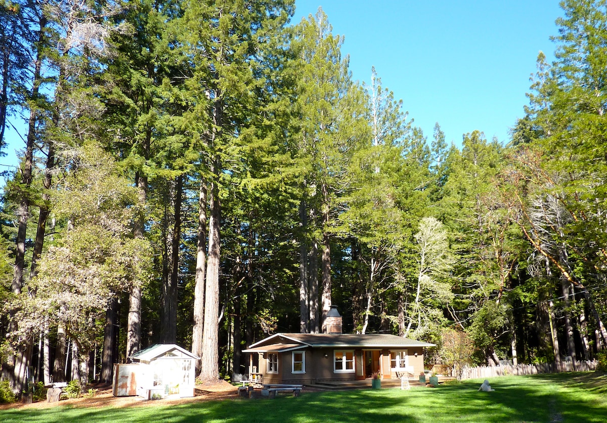 *We're usually closed Nov-Feb. Open to messages! Our cabin is nestled among redwood trees a few miles from the wild Pacific Ocean, historic Mendocino, and the Anderson Valley wine country. A place to relax, recharge, or finish a creative project. Bookings include Mendocino County tourism tax. No pets due to wildlife, and host allergies. Note: bear, fox, hawks, quail, bats, lizards, banana slugs, bobcat, spiders are part of the forest ecosystem and may occasionally visit the vicinity.