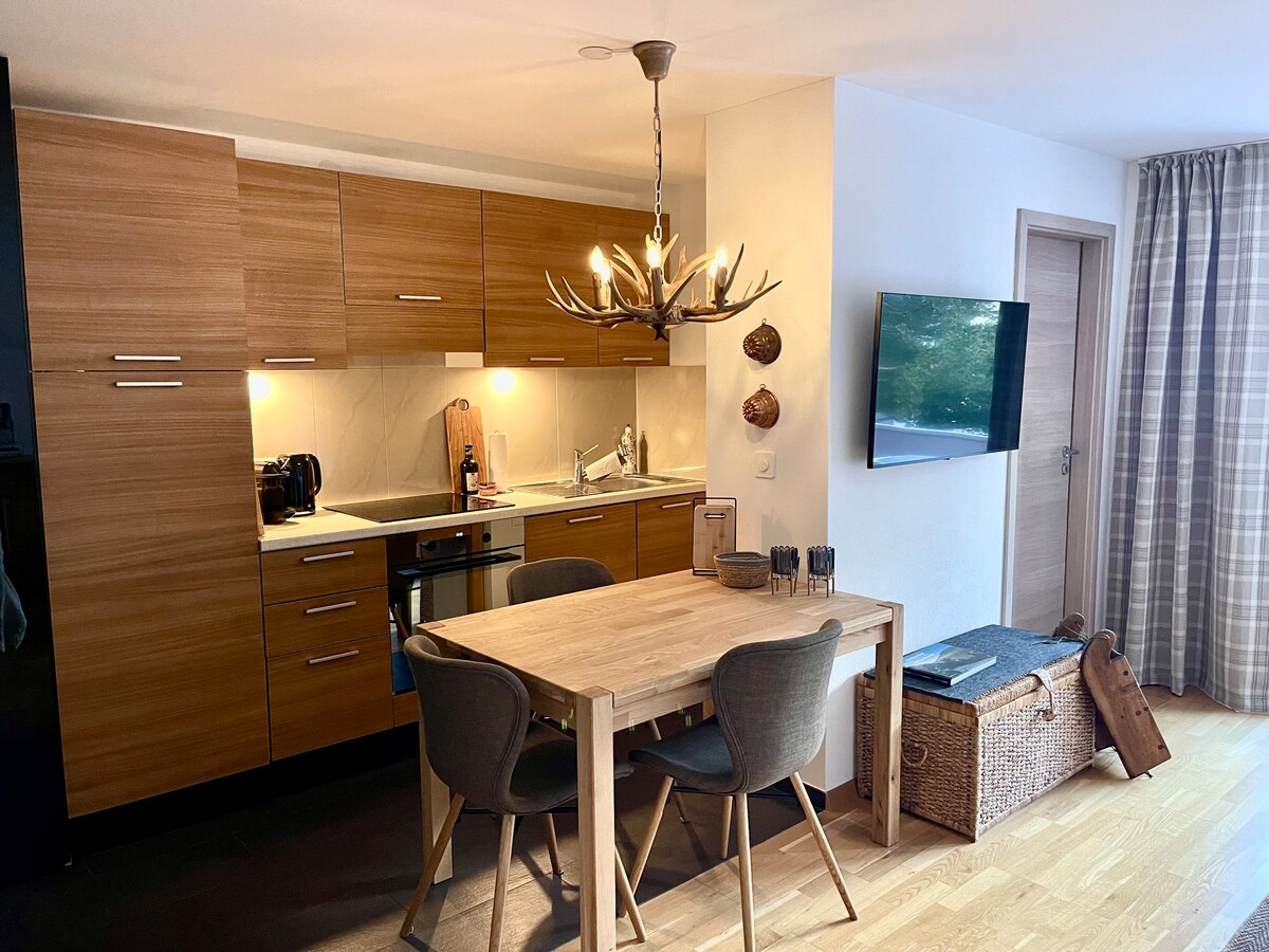 Apartamento renovado con cama de somier, balcón soleado y cocina totalmente equipada en una ubicación céntrica y tranquila junto al lago. Estacionamiento gratuito. En 5-15 minutos: centro, panadería, supermercados, restaurantes, pista de esquí de fondo y autobús de esquí. El juego de fondue y raclette, la iluminación regulable, el televisor nuevo y el altavoz con Bluetooth garantizan noches acogedoras. Internet de alta velocidad hace posible la transmisión y la oficina en casa. Disfruta de tu desayuno en el balcón, del sol en la terraza de la azotea o nada en la piscina.