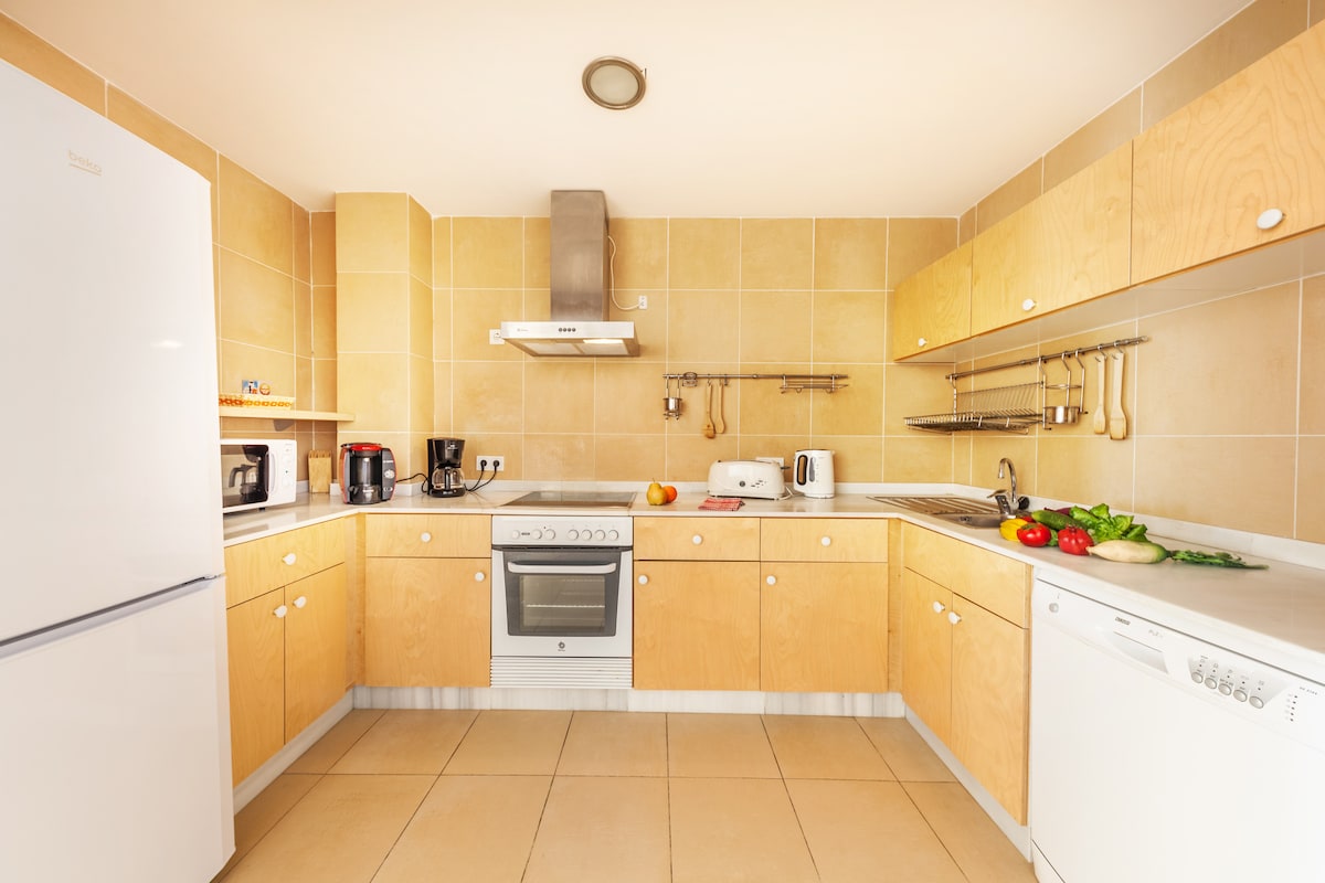 El apartamento de 130 m2 es ideal para familias y amigos que quieren unas vacaciones de relax. En la terraza hay una mesa con sillas y butacas. Desde el balcón tiene acceso al salón-comedor, que está equipado con un cómodo sofá, mesa y sillas para 6 personas. Allí se podrá relajar con un buen libro, mirando la TV por satélite o echando una siesta. La cocina nueva tiene microondas, cafetera, lavavajillas, horno, frigorífico y mucho más. Consta de Tres dormitorios dobles.