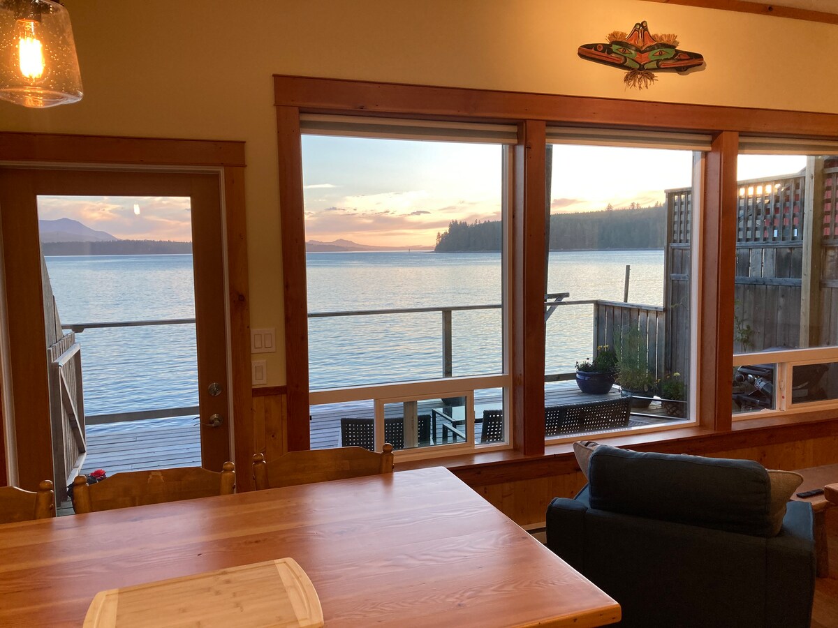 Moderna casa de 1700 pies cuadrados construida sobre el agua con cubierta envolvente totalmente cerrada. Vistas privadas sin obstáculos de la isla de Vancouver y el estrecho de Johnston desde todas las habitaciones. Excelentes muebles y acabados con wifi y Apple TV. Barbacoa en la terraza con mesa, 6 sillas y lámparas de calor. Aparcamiento gratuito y seguro en el sitio, cerca de la tienda de comestibles, la farmacia y el centro de visitantes. Cerca del museo de las Primeras Naciones, Big House y el tótem más alto del mundo. Abundantes rutas de senderismo. Comunidad vacunada que da la bienvenida a los visitantes.