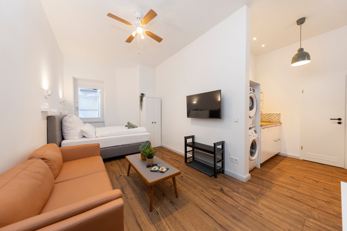 Este cómodo estudio ofrece 26 metros cuadrados de espacio. Ideal para un máximo de tres personas, su cama doble (160x200 o 180x200), la cama individual (90x200) y el moderno baño con ducha hacen de esta estancia una forma perfecta de experimentar Berlín. También ofrece una pequeña cocina y una mesa de comedor, por lo que tendrás todo lo que necesitas para la máxima comodidad y el mínimo estrés.