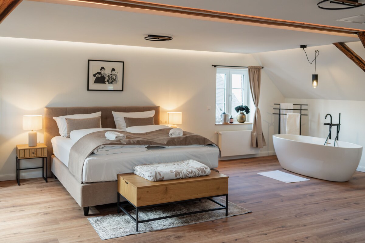 LuxApart Vista is your luxurious holiday home in the Eifel, featuring a panoramic outdoor sauna – perfect for couples, families, and friends. Enjoy 135 square meters of comfort with a breathtaking view of the Eifel forests. Two peaceful bedrooms, a modern kitchen with an island and access to a 70 sqm terrace, as well as a cozy living room with a Smart TV and fireplace. Relax in the outdoor sauna and experience the perfect getaway – whether romantic as a couple, with family, or with friends.