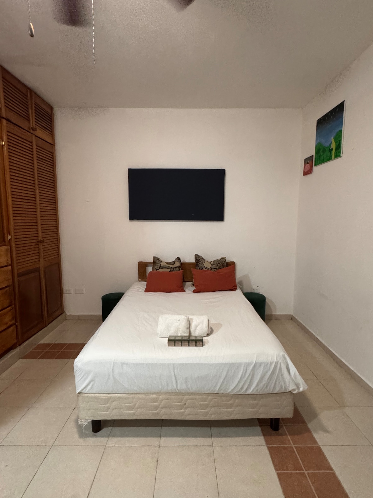 Disfruta de un alojamiento tranquilo y céntrico. La playa mas cercana esta a 20min en auto, el paradero del bus está a 7min caminando para ir a la Zona Hotelera o al centro de la ciudad y el Aeropuerto queda a 30min en auto. Dpto en 2do piso, cerca de plaza, cine, restaurantes, banco, super, tiendas. Cuenta con cama Queen Size, aire acondicionado, baño con regadera y agua caliente. La cocina y la sala están en el mismo espacio con refrigerador, licuadora, cafetera, microondas, mesa, TV y WiFi.