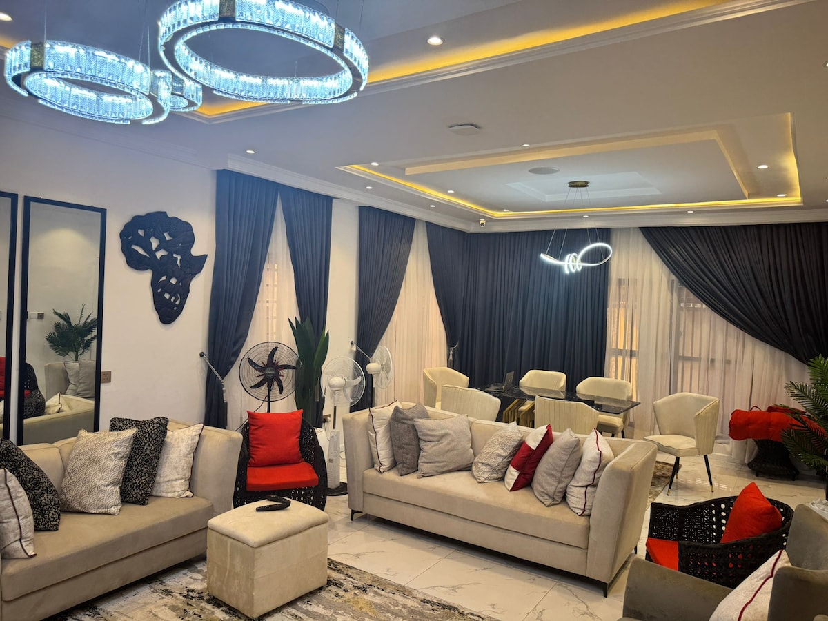 Experimenta la comodidad y la elegancia en esta exquisita casa, magnífico exterior e interior amueblado con buen gusto. Relájate en una espaciosa sala de estar, relájate en dormitorios acogedores cada uno con su propio hermoso baño. Ubicado en una de las fincas más seguras de Lagos. Servicios: cancha de tenis/baloncesto, senderos panorámicos para caminar/correr. A minutos del aeropuerto, acceso rápido a todas las partes de Lagos. El puente Third Mainland y las principales autopistas a los estados circundantes están cerca, perfectos para viajeros de negocios y placer.