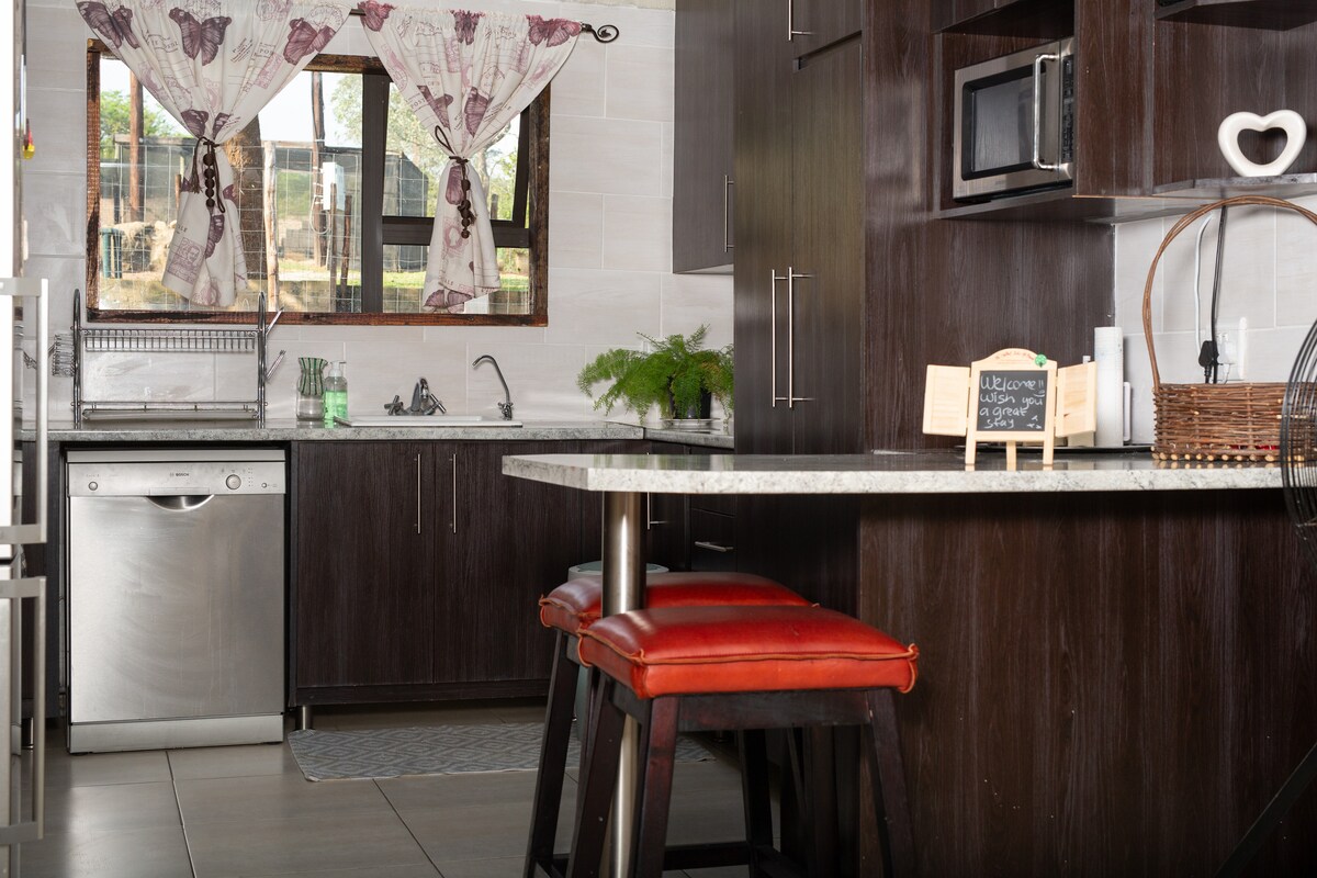 ¡Elegancia y comodidad! Una hermosa y nueva suite loft de 55 metros cuadrados ubicada en un callejón sin salida tranquiloquente en una finca de golf de 18 hoyos. Disfruta de la tranquilidad de contar con seguridad de primer nivel y energía solar para que nunca tengas que preocuparte por los cortes de energía. Entrada privada. Relájate en una lujosa cama tamaño queen, las mejores sábanas de algodón egipcio y un lujoso edredón y almohadas de plumón de ganso. Hervidor, microondas y nevera. Disfruta de cafés de filtro de calidad, tés y biscotes. Televisor de pantalla plana con paquete DSTV completo y wifi de fibra.