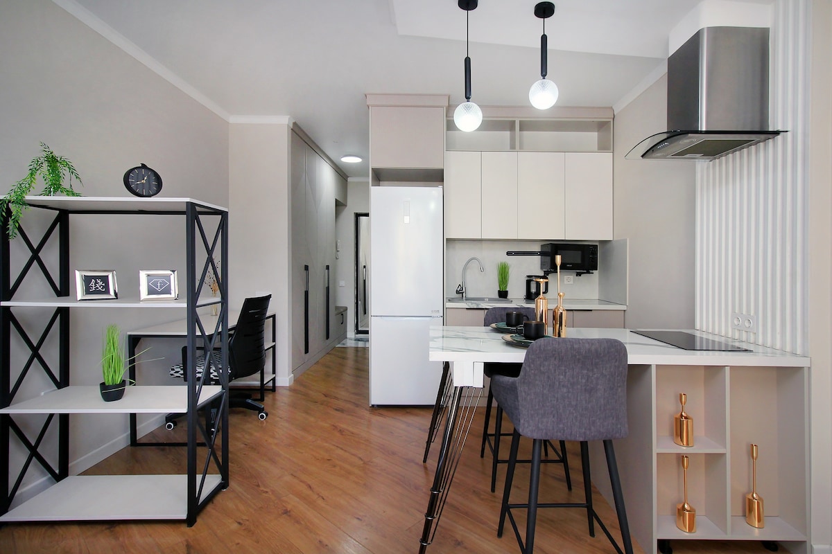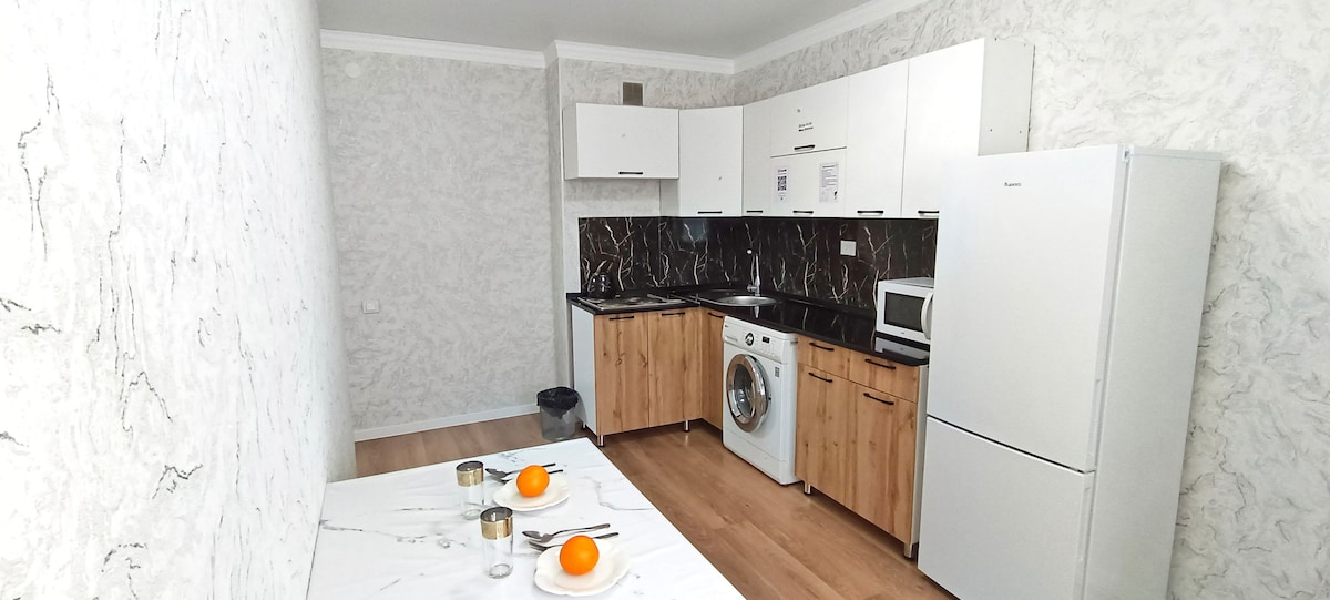 Que tengas una buena estancia en nuestro precioso estudio. Acogedor y funcional estudio en la ciudad de Almaty para 2-4 personas. Se admiten bebés y niños. El alojamiento entero recién reformado tiene todo lo necesario para que tu estancia sea cómoda. El apartamento tiene cocina totalmente equipada, wifi y todas las comodidades necesarias. El apartamento está situado junto al gran centro comercial con una gran variedad de restaurantes, cafeterías y un supermercado. La calle principal City Walking está a 10 minutos a pie.