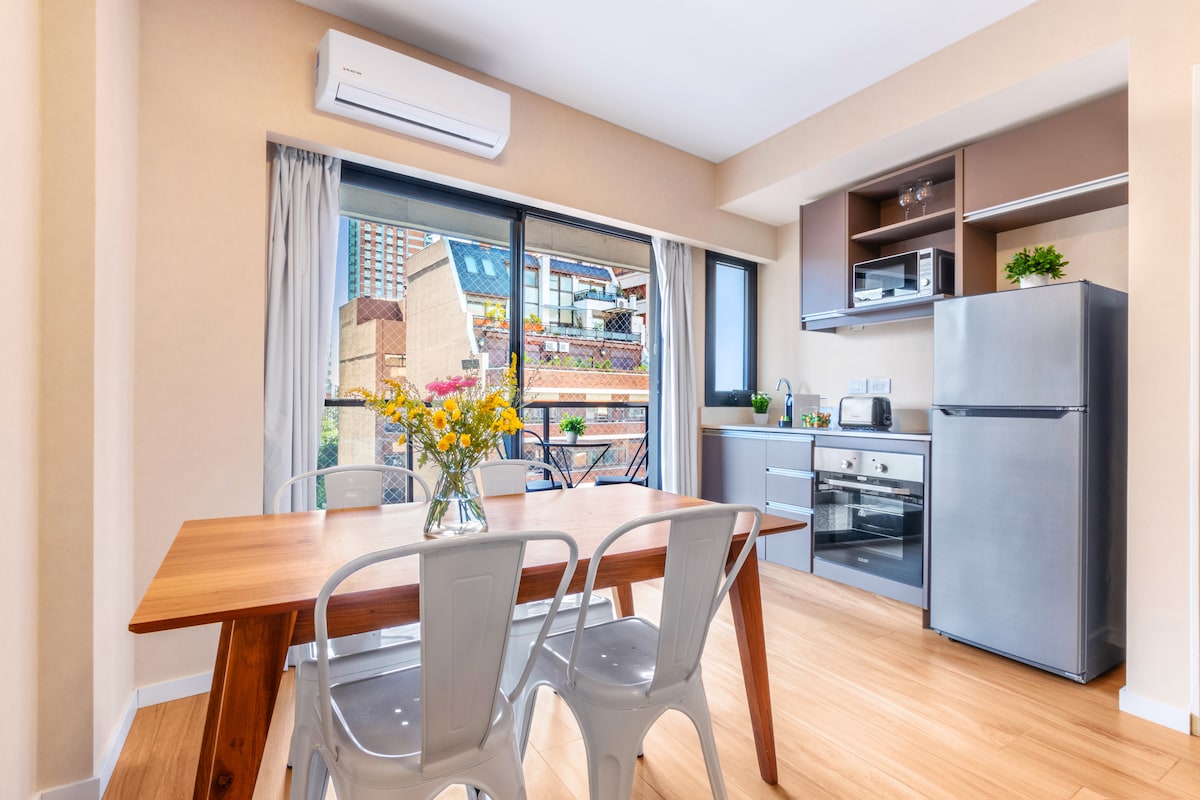 Amplio monoambiente, con cocina separada, totalmente remodelado con todo el estilo y las comodidades en la mejor ubicación de Buenos Aires. Frente al Alto Palermo shopping, cerca de parques, principales avenidas y subte . Cama dos plazas, Smart TV, baño completo con bidet, ducha y secador de pelo, cocina con Heladera y Freezer, tostadora, cafetera y microondas con grill. Cortina blackout automáticas con control remoto. Aire acondicionado Frío Calor.