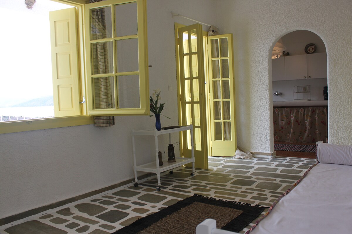 La casa fue construida antes de 1940 y en ese entonces solía ser la casa del maestro del pueblo. El sótano era el trastero de la resina. Solo en 1975, mi abuelo, Dimitris, también pudo comprar la casa y el sótano, con el fin de usar todo el edificio como trastero. Luego, en 2019, mi familia decidió transformar el piso de arriba como una habitación de Airbnb y el sótano como trastero para el vino y el aceite.