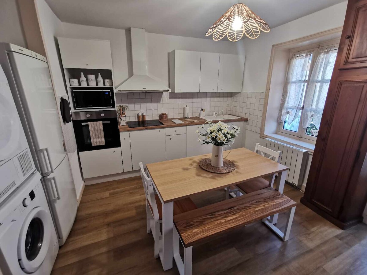 En pleno centro del pueblo, en plena naturaleza. venga a relajarse en una casa totalmente renovada. Tiene una cocina abierta en el salón con chimenea y tres dormitorios, baño y dos inodoros. En el exterior una terraza cubierta con muebles de jardín, barbacoa, mesa de ping ping, bicicleta de montaña y patinetes. tranquilo y apacible. Parcela de 1000 m2, una parte vallada de 70 m2 en la parte trasera de la casa.