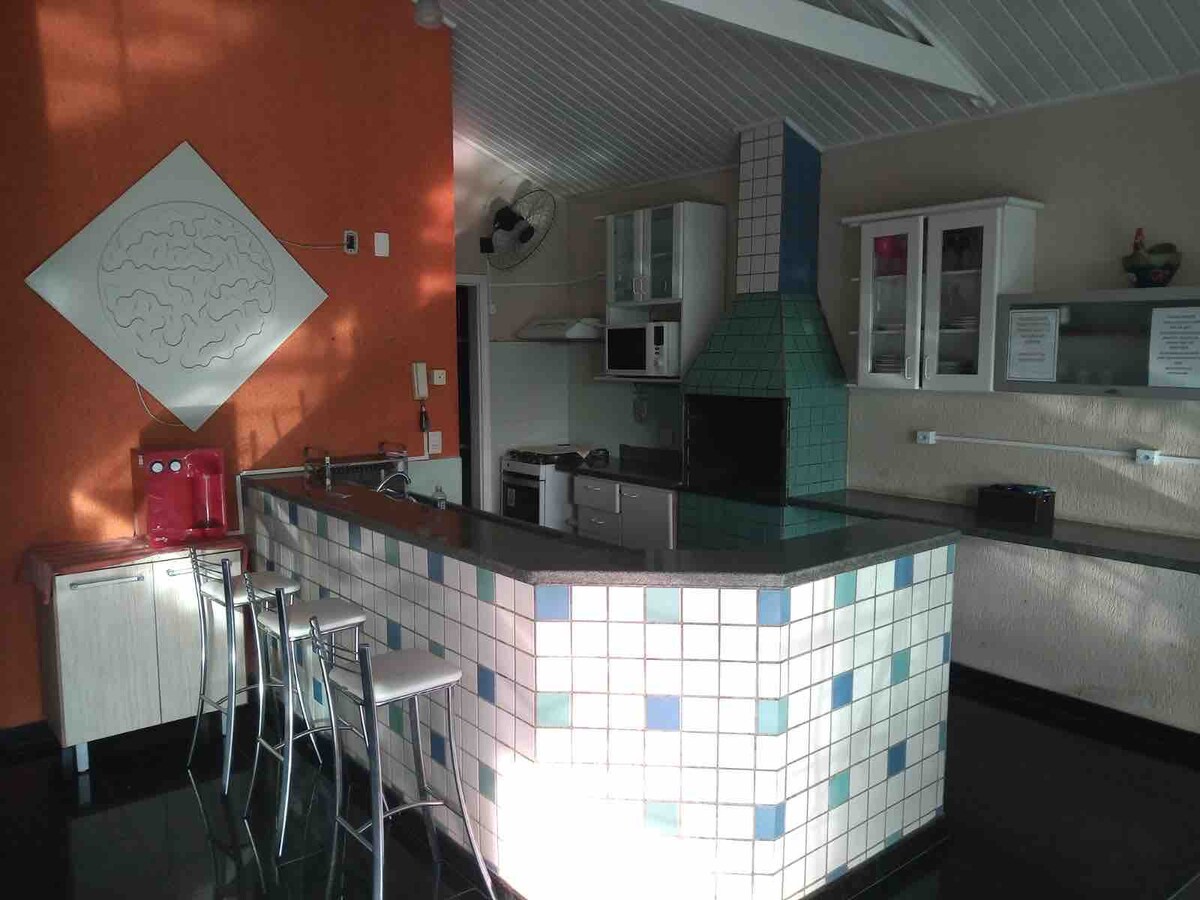 Casa con alojamiento para un máximo de 16 personas. Amplio espacio, campinho de soccer quadra de volei/tenis de playa/fut volei para adultos y piscina para niños. Amplia zona de barbacoa con cocina completa, sala de estar y sala de televisión con chimenea. Habitaciones equipadas con aire acondicionado.(4 con aire acondicionado y 2 dormitorios con ventiladores) Alojamiento bien ubicado y totalmente cerrado para mayor privacidad.