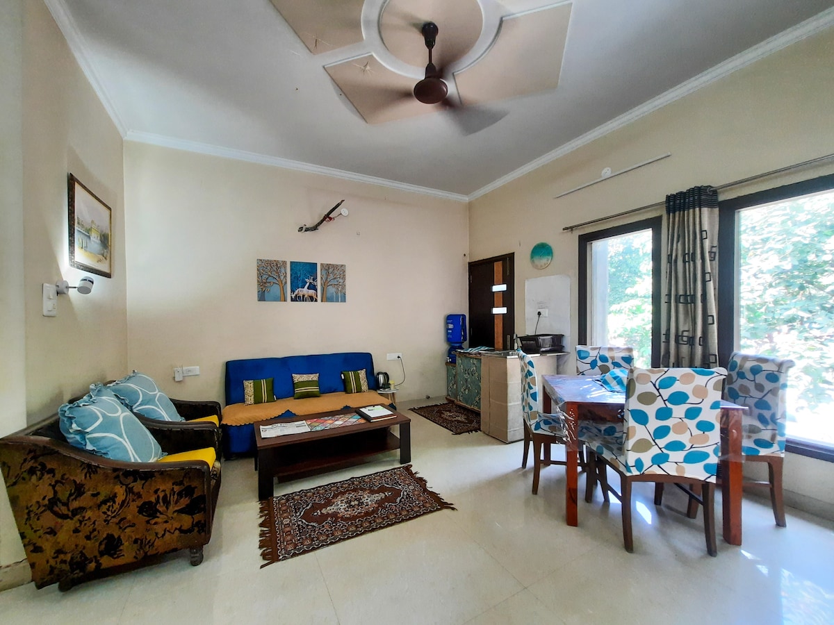 • Apartamento recién construido, totalmente privado en el primer piso • 3 dormitorios tamaño king, 2 baños, gran sala de estar y balcón con vistas verdes • Cocina modular, placa de inducción, agua RO y utensilios de cocina básicos. Swiggy/Zomato/Instamart/Blinkit disponibles • Aire acondicionado dividido, calefacción opcional, paneles de pared LED y noches de karaoke opcionales • Ubicación privilegiada en el centro de la ciudad: cerca del Templo Dorado, tiendas y restaurantes locales • Ambiente residencial tranquilo y silencioso, ideal para familias y grupos • Orientación local personalizada del anfitrión y comodidad premium