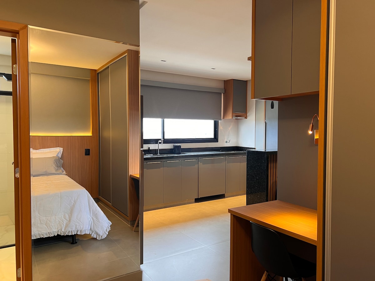 Nuevo departamento de 1/4 en el Complejo Médico Gran Life, en el centro de Anápolis, GO. Capacidad para 3 huéspedes. Cuenta con 1 habitación con baño, cama doble, aire acondicionado y armario. Sala de estar con sofá cama, cocina completa (microondas, horno eléctrico, filtro, refrigerador, estufa, licuadora, cafetera eléctrica), baño social y espacio de trabajo. Condominio con piscina, gimnasio, área infantil y estacionamiento. Hermosa vista y ubicación privilegiada, cerca de todo. ¡Comodidad y practicidad en un solo lugar!