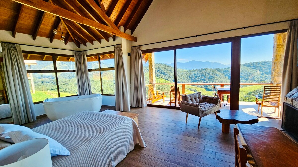 Casa Solis - Um refúgio de alto padrão com sauna privativa, banheira de imersão e uma vista panorâmica deslumbrante da Serra da Mantiqueira. Foi projetada para casais que desejam viver dias de descanso, romance e conexão em um cenário simplesmente inesquecível. Você acorda com o nascer do sol iluminando as montanhas, tem acesso a um lavandário particular e encerra o dia com vinho ao redor do fogo ou ao som aconchegante da lareira. Somente a 3 horas da cidade de SP.