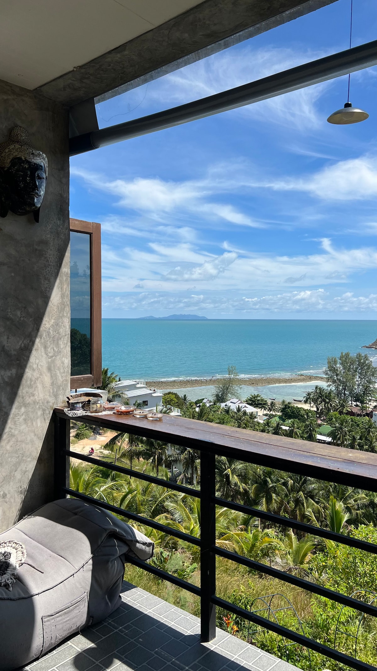 Villa Santorini.☀️ Uno de los mejores puntos de vista en la isla de Ko Phangan. Impresionante vista. Villa elegante y personalizada. Lugar único, tranquilo y hermoso. Increíble casa, lo tienes todo para una vida cómoda. Totalmente amueblado. Dos grandes zonas de armario, muchos cofres y cajones, muchos enchufes, cocina grande, tienen todas las cosas y técnicas para cocinar, 2 refrigeradores, wifi rápido, aire acondicionado, chimenea y cocina con barbacoa afuera, rincón deportivo, territorio privado, paredes verdes y jardín de flores alrededor.