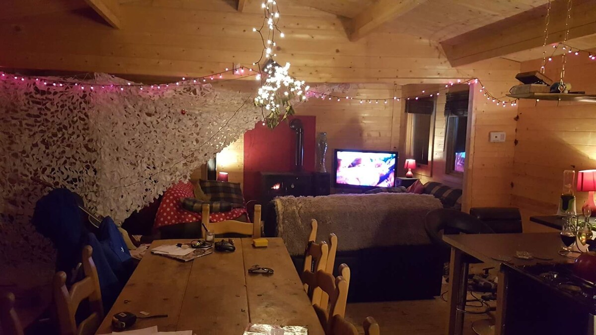 Moderna, luminosa y espaciosa cabaña de madera de estilo alpino con hermoso dormitorio/salón de planta abierta con quemador de leña tostado. Cocina moderna con horno doble, placa de 4 anillos, lavavajillas. Comedor. Ducha de lluvia a ras de suelo, radiador/calentador de toallas y calefacción por suelo radiante. Roku TV, wifi de banda ancha, lavadora y secadora. Aparcamiento dentro de la zona privada, totalmente vallada y segura para perros. Uso EXCLUSIVO de la bañera de hidromasaje. Cómoda cama tamaño «superking» :) Añade la tarifa por mascota a la reserva, ¡gracias! A 25 minutos de Zip World.