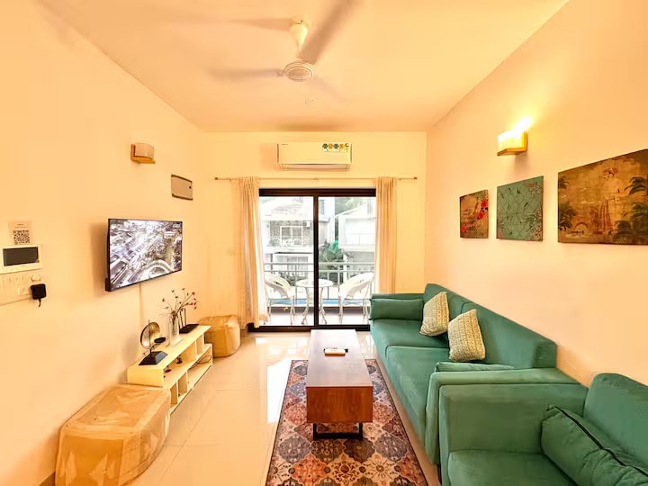 Modern Boho Apartment | Minutes from North Goa's Beaches.A cozy, fully furnished 1BHK retreat on ground floor perfect for couples, friends, or small families. Highlights: - Stylish Boho Interiors with a warm vibe - AC in bedroom & living room for comfort - Smart TV + High-speed WiFi - Equipped kitchen with RO water, cooktop, fridge & washing machine - Shared swimming pool (9 AM–6 PM | swimwear mandatory - On-site gym available at INR 200/-per person per day - 24/7 security - Free Parking