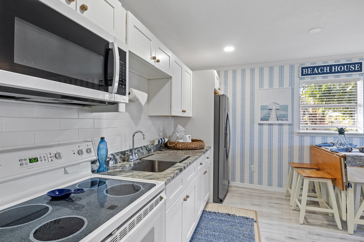 ONE SHELL COVE on Anna Maria Island has been totally remodeled after Hurricanes Helene and Milton. Wonderful studio floor plan with amazing kitchen. Beautiful view of the waves and the beach right outside your window. Grab your towel, take a few steps and you're on the beach. The sand comes right up to your door in this ground floor unit. Amazing Location Walk to some restaurants Free Trolley goes up and down the Island Rent Kayaks and Paddleboards and enjoy the Beach