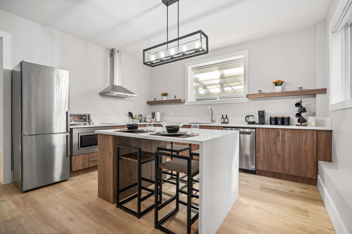 Una suite espaciosa con un hermoso jardín que cuenta con cocina completa, área de comedor y sala de estar de concepto abierto y un baño privado. Duerme bien en una cama tamaño queen con sábanas blancas y almohadas celestiales. Disfrute de wifi gratuito, vea sus películas favoritas de Netflix en un televisor enorme y relájese junto a una cálida chimenea eléctrica. ¡El café de la mañana y las botellas de agua son de cortesía! Ubicado en un barrio tranquilo con estacionamiento gratuito. A 20 minutos en auto desde/hacia la terminal de ferry de Tsawwassen. A 30 minutos en auto desde/hacia el aeropuerto YVR.