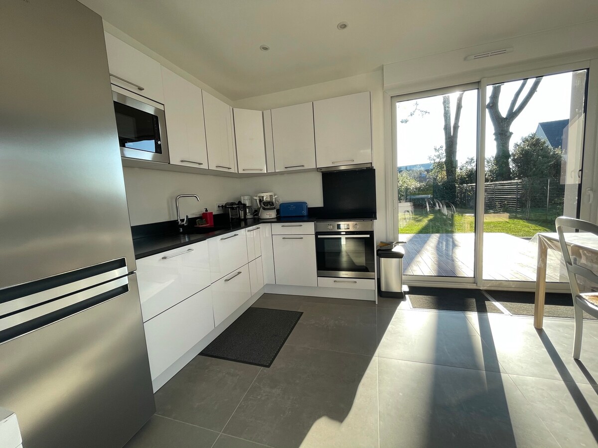 La casa Guelan está totalmente equipada, permite alojar hasta 8 personas. Construida en 2024, dispone de 4 dormitorios, 3 baños, una gran terraza orientada al sur y un jardín con césped. Disfruta de la comodidad de las instalaciones modernas con persianas enrollables, calefacción por suelo radiante y paredes insonorizadas. Acceso a la playa, sendero de senderismo/GR a 200 m. Carril bici frente a la casa y posibilidad de alquilar bicicletas cerca. El aparcamiento ofrece estacionamiento para 2 coches sin problemas.