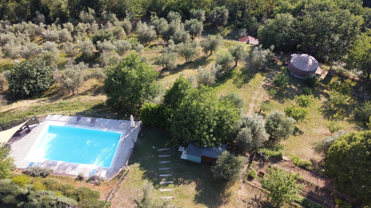 Conéctate con la naturaleza y el universo a través de una experiencia en nuestra granja orgánica con animales, en una original yurta mongola insertada en un pequeño Glamping rodeado de bosques toscanos. Lugar panorámico montañoso a 20 minutos del mar y cerca de las ciudades de arte. Piscina grande Estacionamiento reservado e inodoros separados pero cercanos, cenador equipado con mini cocina y nevera. La posibilidad de degustar nuestros productos típicos de la Toscana hará que esta estancia sea inolvidable.